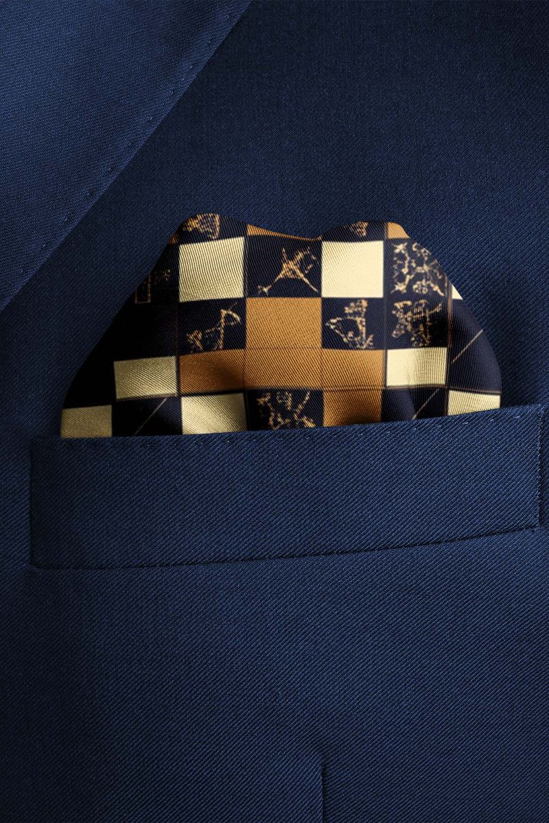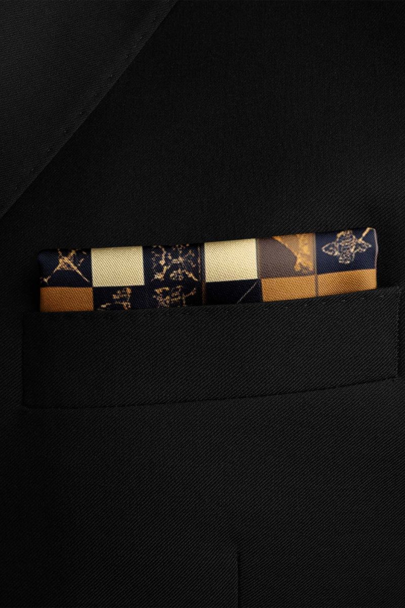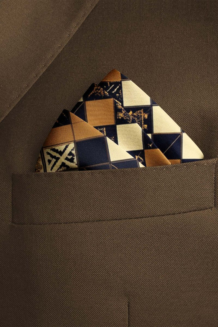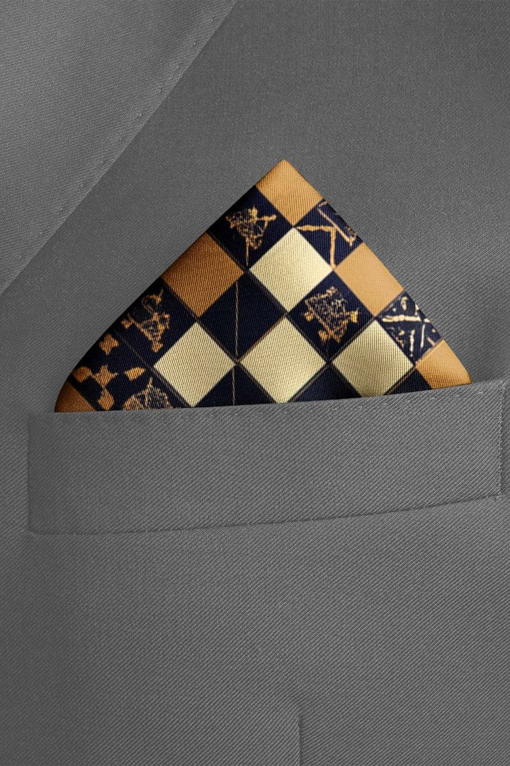 Elegant pocket square, featuring a checkerboard pattern in cream, gold, and black, adorned with unique geometric and floral designs.