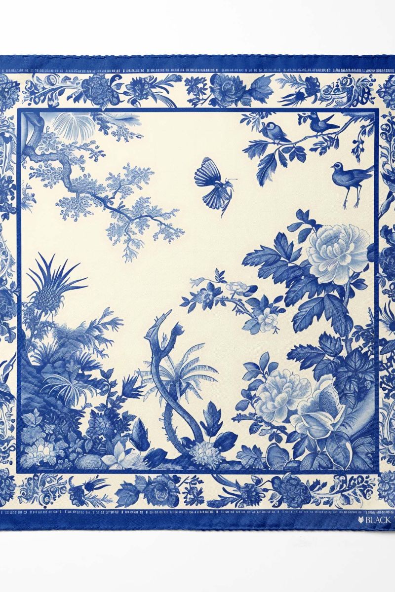 Sophisticated white pocket square with a rich blue border featuring a delicate botanical motif of flowers, leaves, birds, and butterflies in fine blue ink, radiates both elegance and versatility.