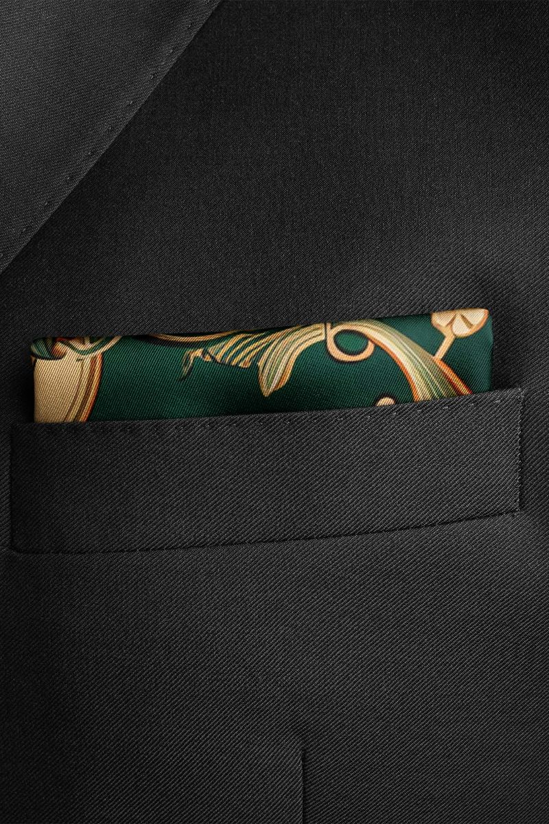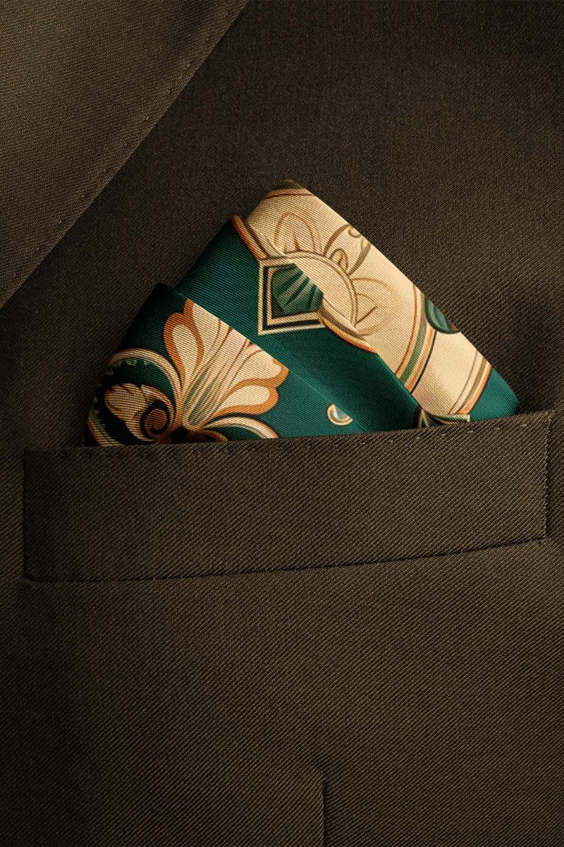 Elegant fir green pocket square, adorned with leaf motifs, exudes sophistication and versatility, perfect for men's suits....