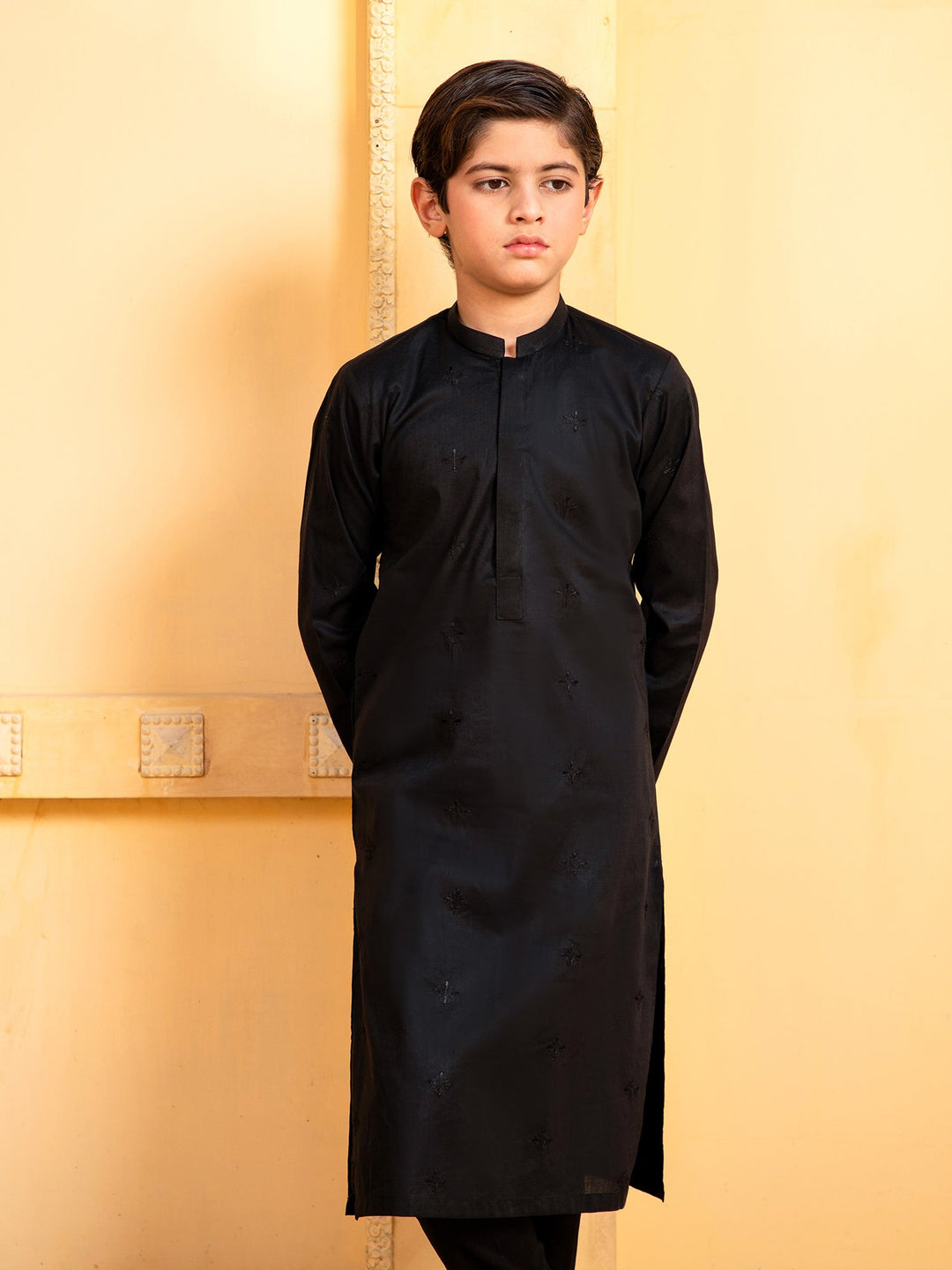 Description: A modern signature embroidered kurta with Mandarin collar; paired with straight trousers. This is a 2-piece stitched outfit.