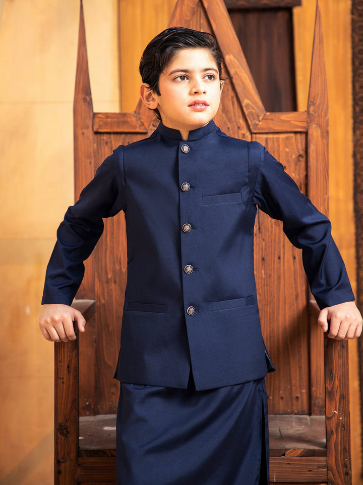 Shahjahan - Boski Navy Blue Kurta Trouser with Waistcoat - 3 Piece