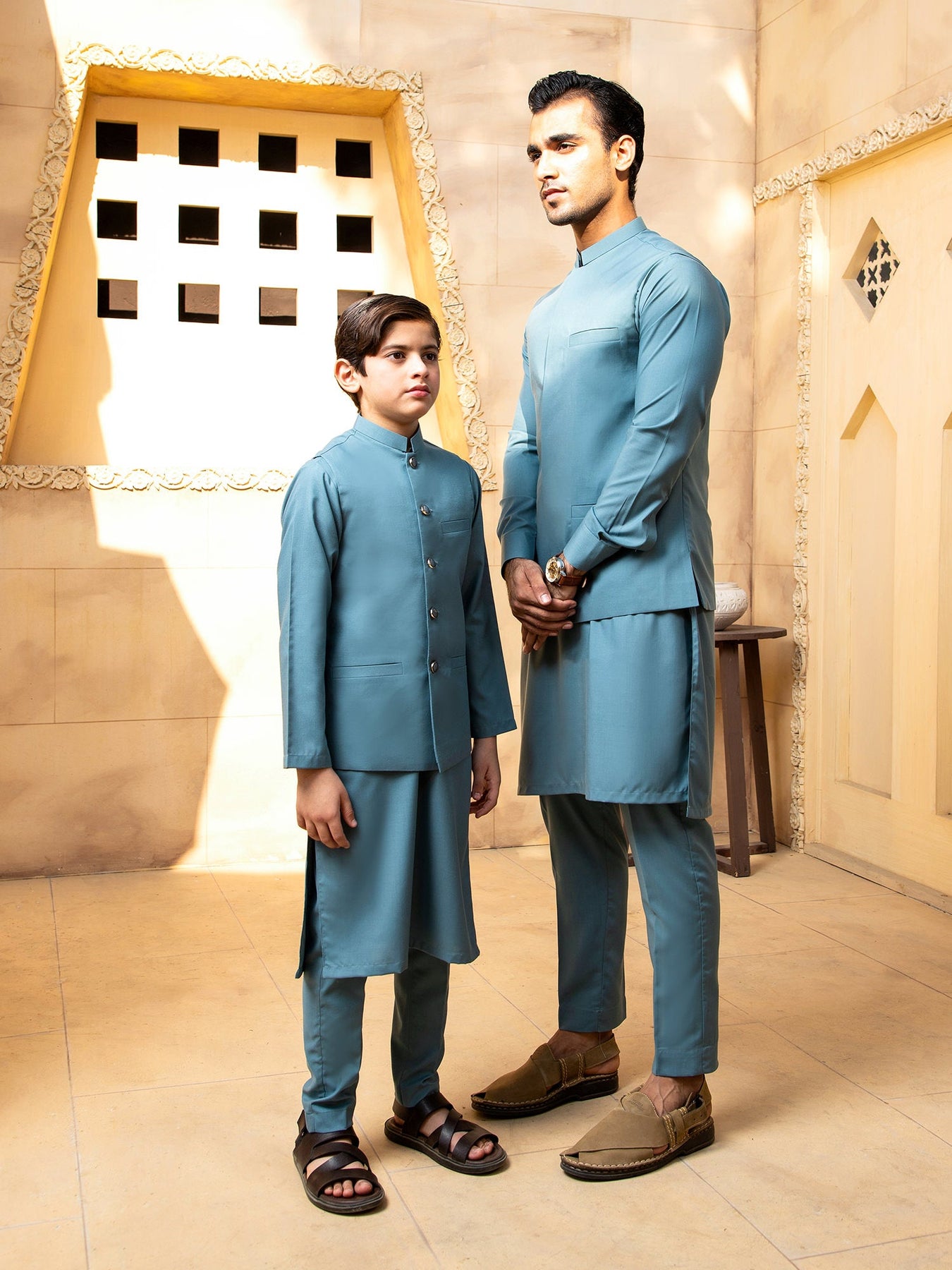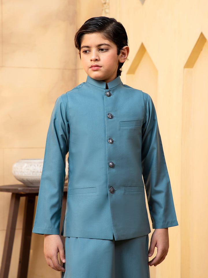 Shahjahan - Teal Kurta Trouser with Waistcoat - 3 Piece