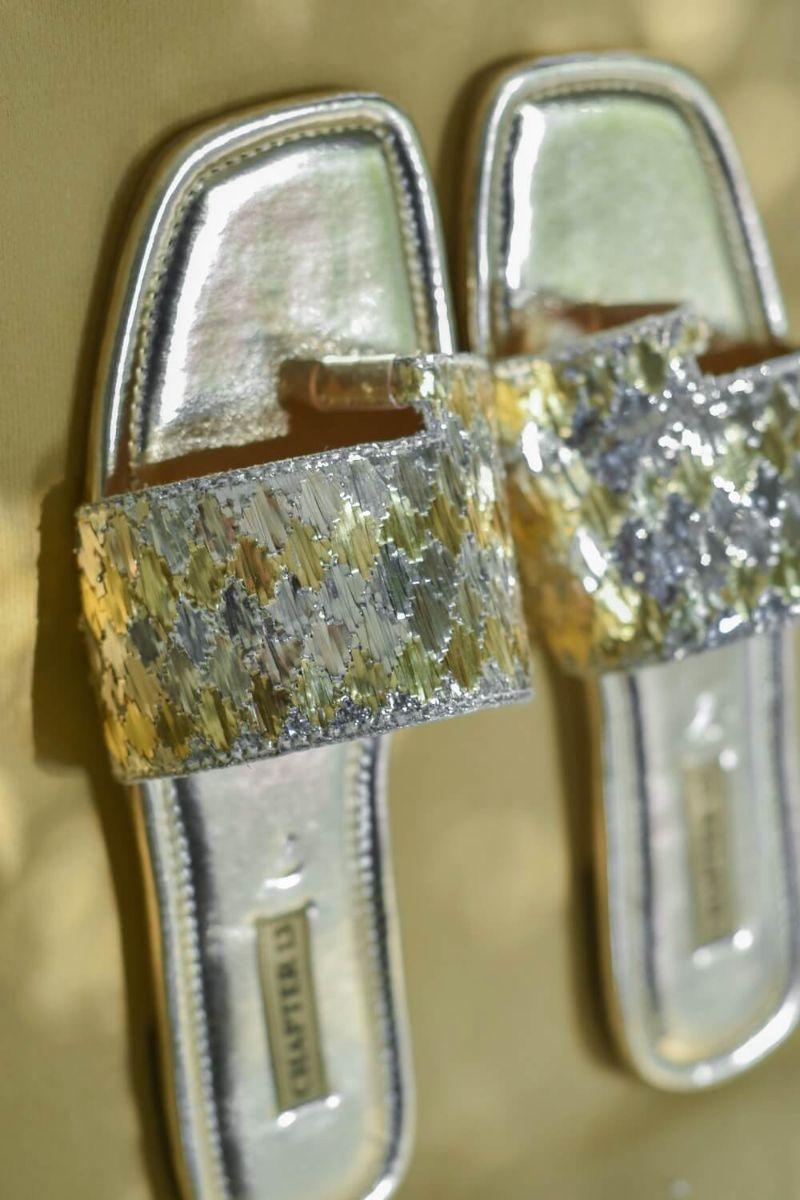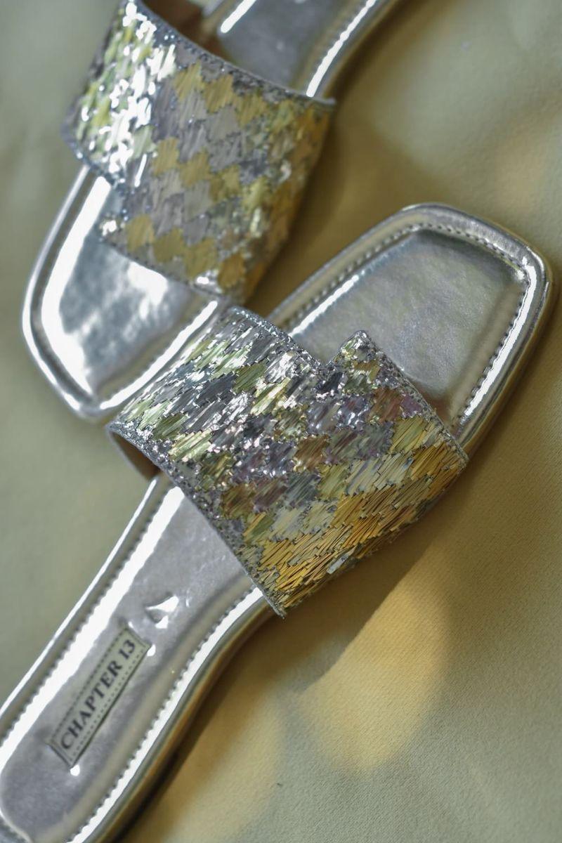 Step into style and comfort with our Chappals! Hand embroidered with three vibrant mukaish colors, these unique diamond pattern slippers feature a stunning hand embroidered pattern. The golden mirror reflective shiny insole adds a touch of elegance, while the foam cushion sole ensures comfort all day. Plus, our anti-skid gel sole keeps you safe and stylish! Upper: Silk and Mukaish Bottom: Anti Skid Gel Sole Please note: Due to the handmade nature of the collection and professional photography lights; colors, and/or patterns may vary slightly from the image shown. Minor differences enhance the beauty and uniqueness of each style