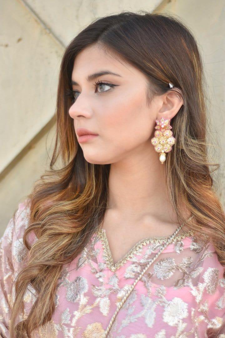 • Beautiful handcrafted gota ear studs made with gota phool and patti embellished with gulabi pink thread detail and pearls