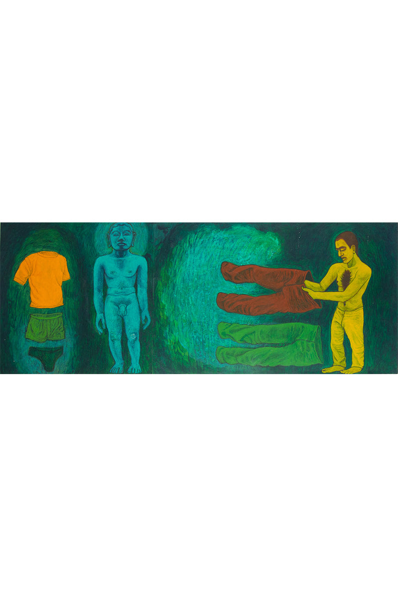 Anwar Saeed is a distinguished Pakistani artist, born in 1955 in Lahore. He graduated from the National College of Arts, Lahore, and furthered his education at the Royal College of Arts in London. Known for his collages, vibrant paintings, and diverse printmaking techniques, Saeed explores themes of masculinity and same-sex desire within Muslim South Asia, often navigating the complex terrain of cultural and religious censorship. Saeed’s work frequently employs motifs such as masks and animal-human hybrids, through which he examines conflicts between religious and social expectations, gender roles, and identity formation in a culturally rich yet politically tumultuous region. These elements are not only a method of self-censorship but also serve to challenge and subtly critique societal norms. Teaching at the National College of Arts since 1986, Saeed has significantly influenced a generation of artists, embedding his deep understanding of Islamic visual culture and South Asian history into his work. His art, rich in symbolic complexity, offers a profound commentary on the dual forces of cultural heritage and contemporary societal pressures.