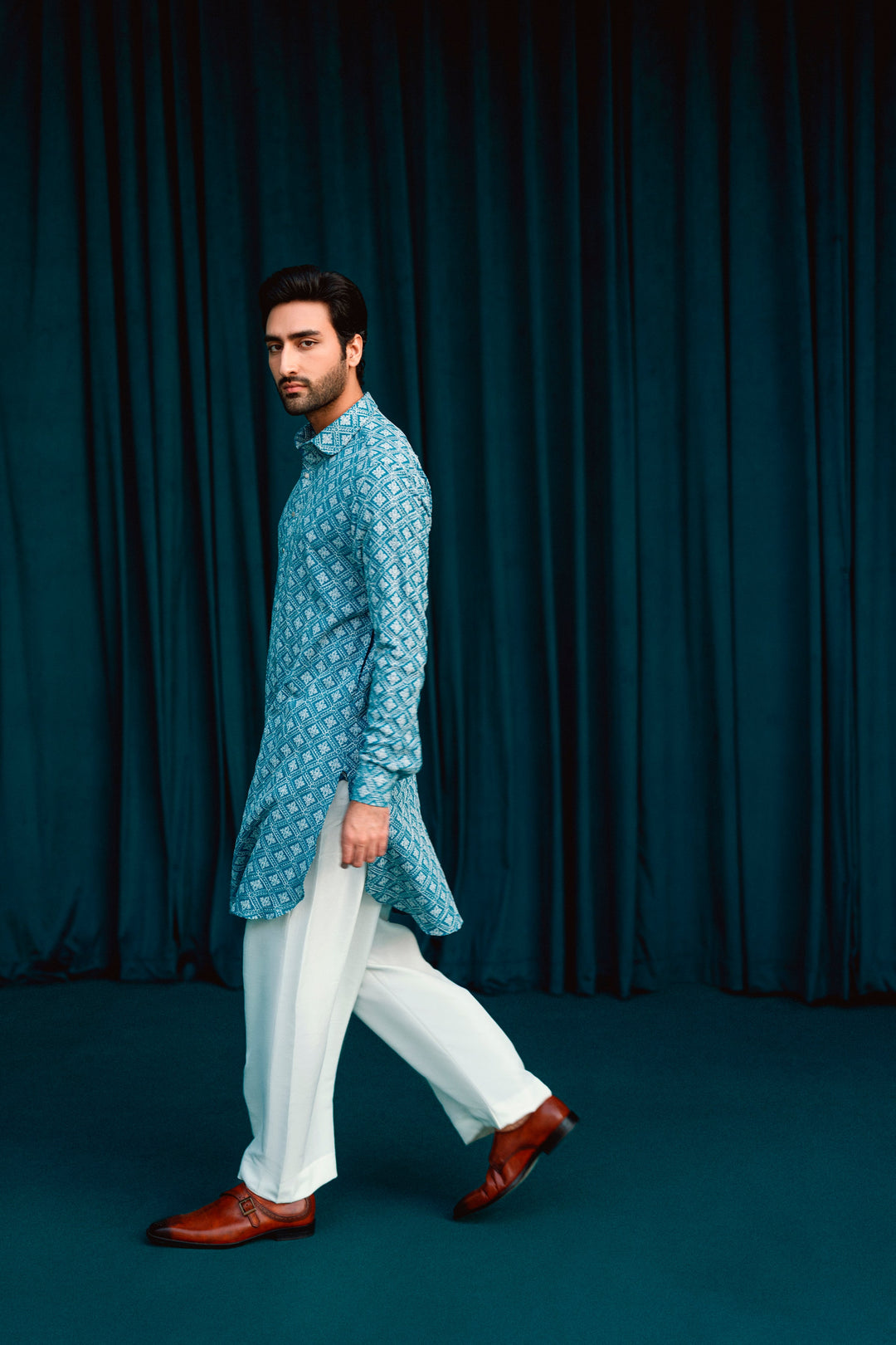 Crafted from premium guaze cotton, this elegant kurta is designed with a refined shirt collar, structured cuff sleeves, and sleek metal buttons for a sophisticated touch. The intricate off-white resham thread embroidery, featuring a modern traditional pattern, adds timeless charm. Paired with a classic Farsi trouser, this ensemble blends heritage and contemporary style, making it a perfect choice for festive and formal occasions.