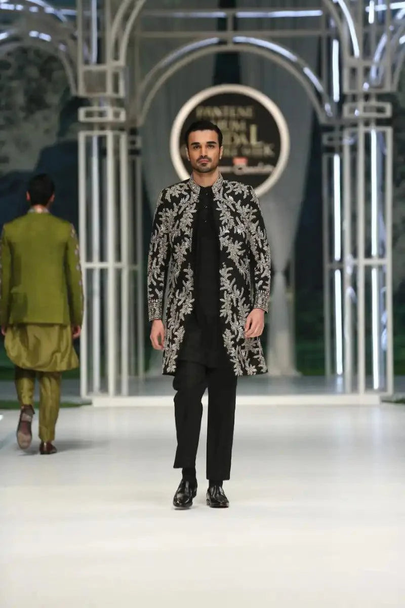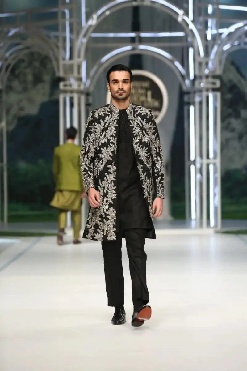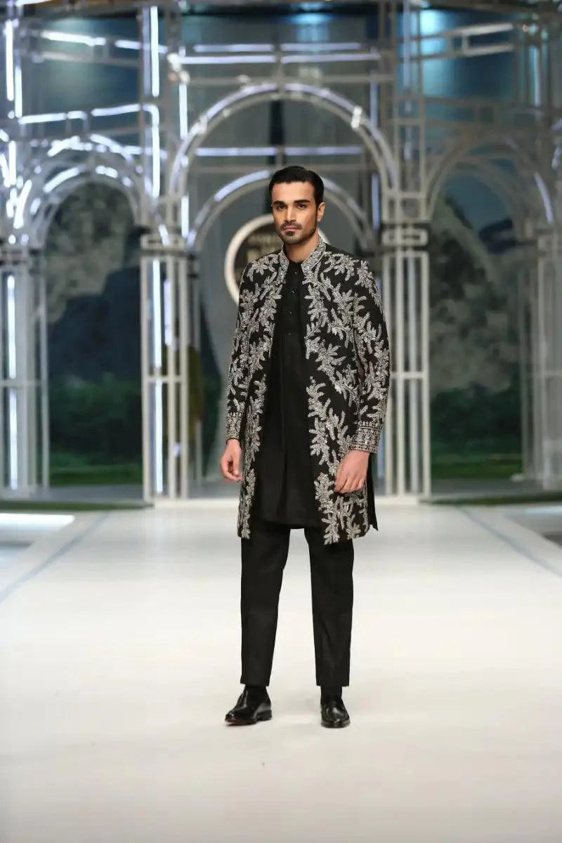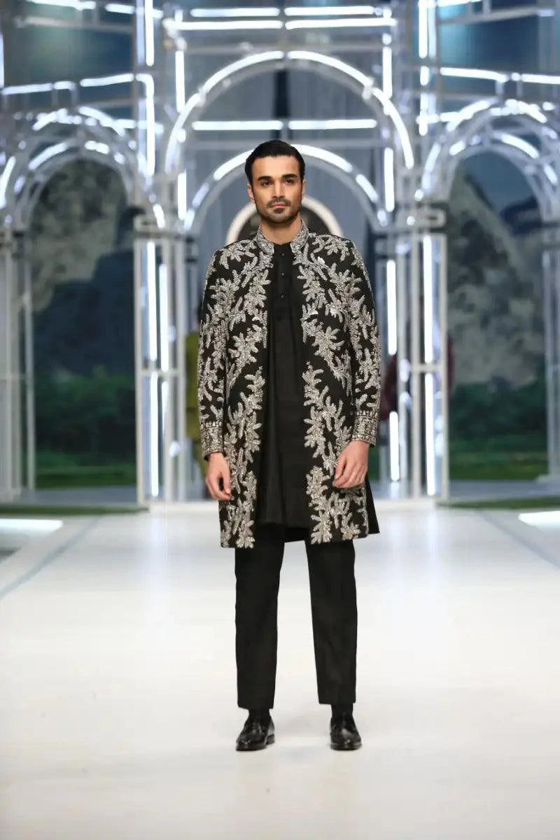 Introducing our exquisite black mid-length Sherwani, meticulously adorned with intricate silver zardozi and resham hand embellishments. Paired seamlessly with a black kurta pajama featuring discreetly placed hidden buttons, this ensemble epitomizes understated luxury and timeless elegance. Elevate your style with this impeccably crafted outfit, perfect for those seeking sophistication with a touch of tradition.