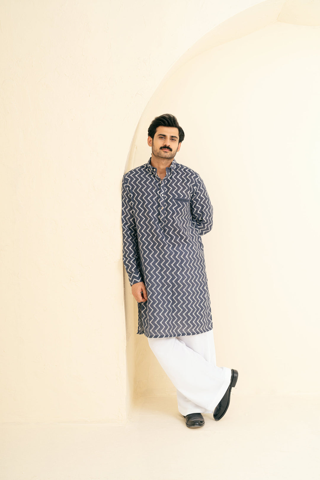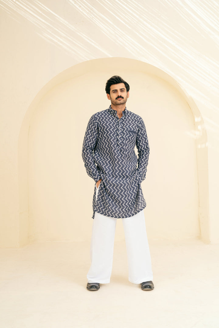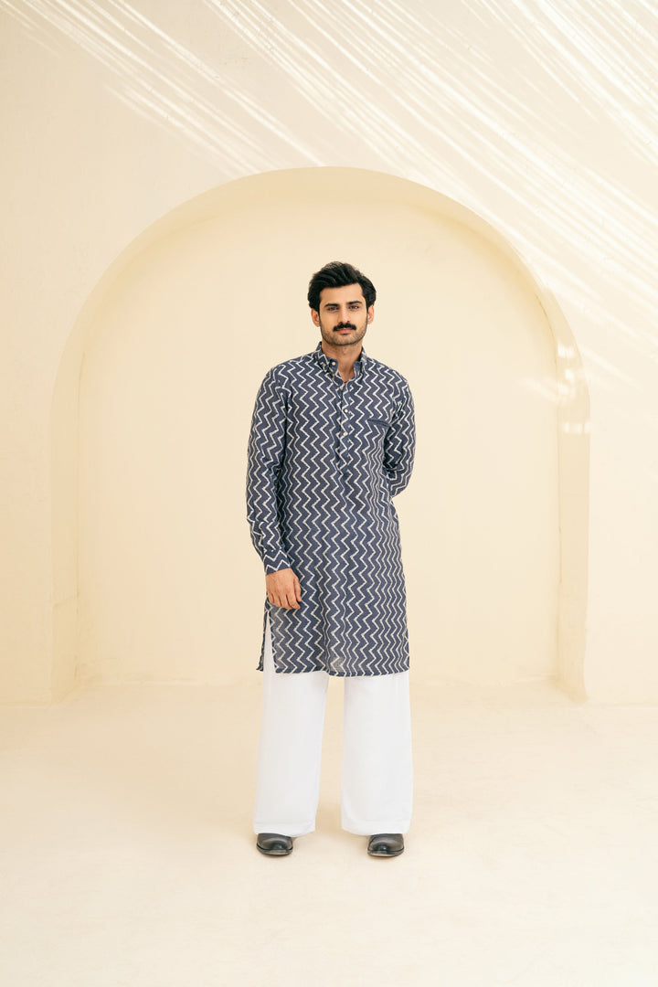 Crafted from jute cotton fabric, this kurta features a button-down shirt collar, cuff sleeves, and a single bone pocket for a sleek and structured look. The white Resham embroidery in chevron patterns adds a modern yet timeless touch. Paired with cotton Farsi trousers, this ensemble offers a perfect blend of texture, elegance, and comfort, making it ideal for Eid or festive occasion