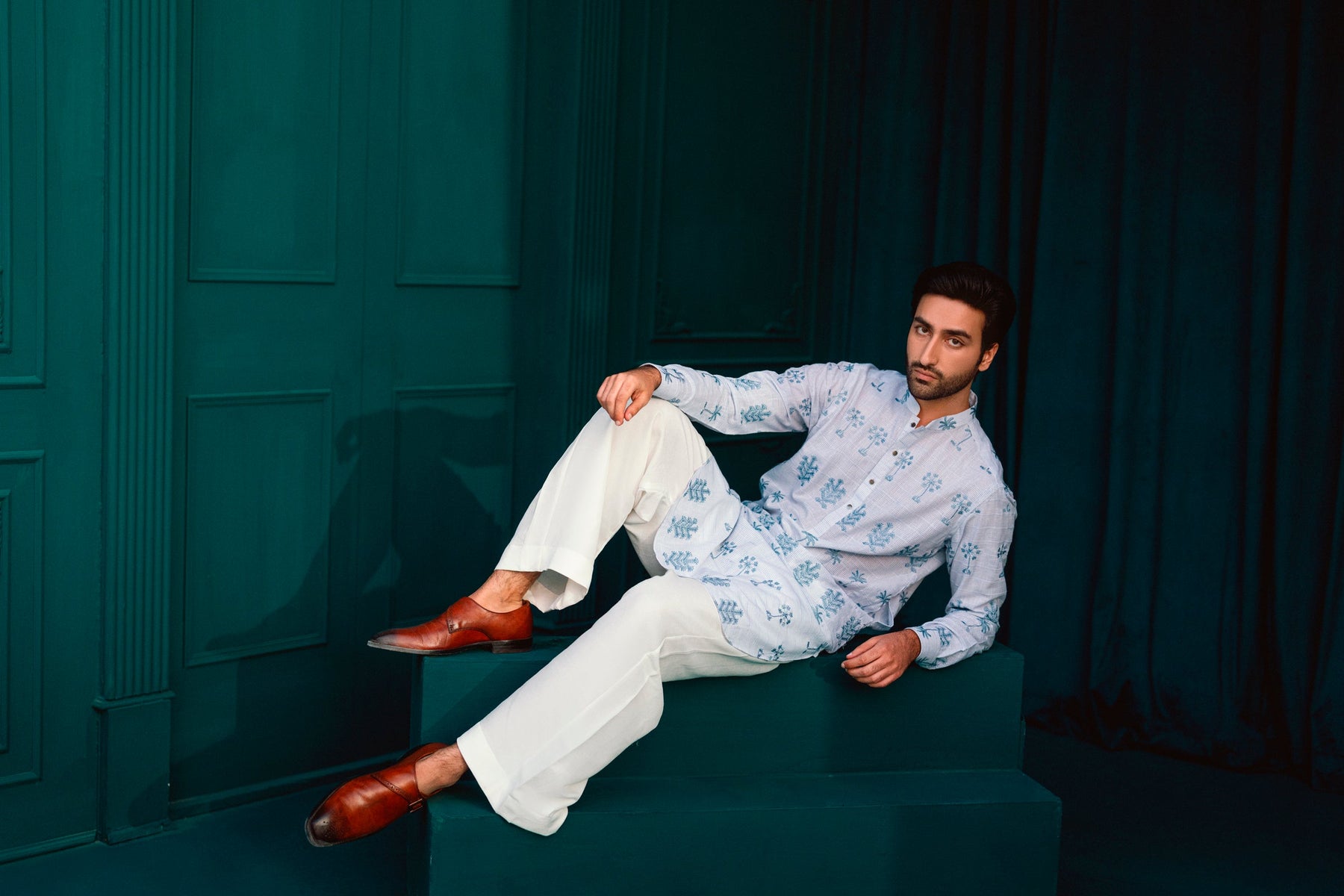 Crafted from premium pinstriped cotton, this sophisticated kurta features a refined sherwani collar, sleek cuff sleeves, and elegant metal buttons for a timeless appeal. The intricate embroidery, blending botanical and traditional motifs, adds a touch of artistry and refinement. Paired with a graceful Farsi trouser, this ensemble seamlessly fuses classic elegance with contemporary style, making it a perfect choice for festive and formal occasions.