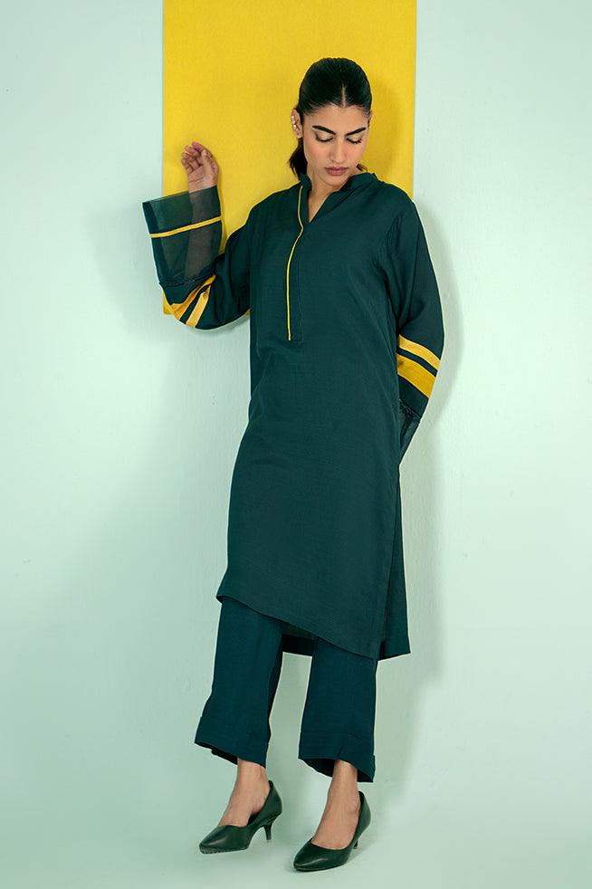 A timeless PK silk kurta featuring contrasting strips on the sleeves for an elegant touch. Paired with straight trousers for a complete look.