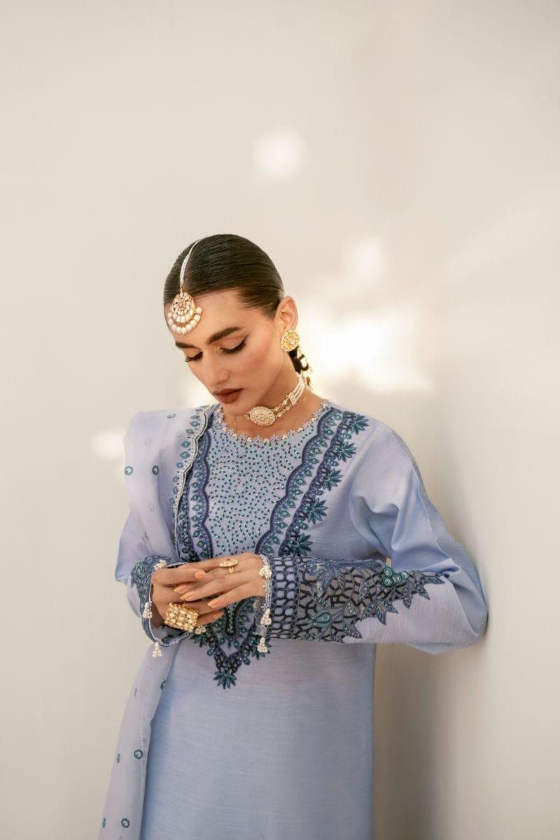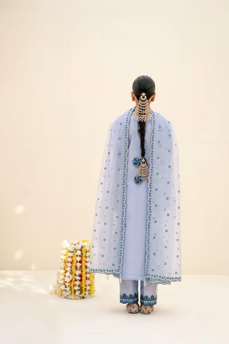 In enchanting shade of blue this ensemble features an amalgamation of bold embroideries with sequin details. Adding unique feminine charm to the look with its delicately designed neckline and sleeves enhanced with lace finishing. Paired with embroidered straight pants and scalloped khadi net dupatta with delicate sequined embroidery. Pieces: 3 PIECE (SHIRT, PANTS & DUPATTA) Fabric: SHIRT (PAPER SILK) PANTS (RAW SILK) DUPATTA (KHADI NET) NOTE: EMBELLISHMENTS ARE NOT INCLUDED IN THE STITCHED OUTFIT.