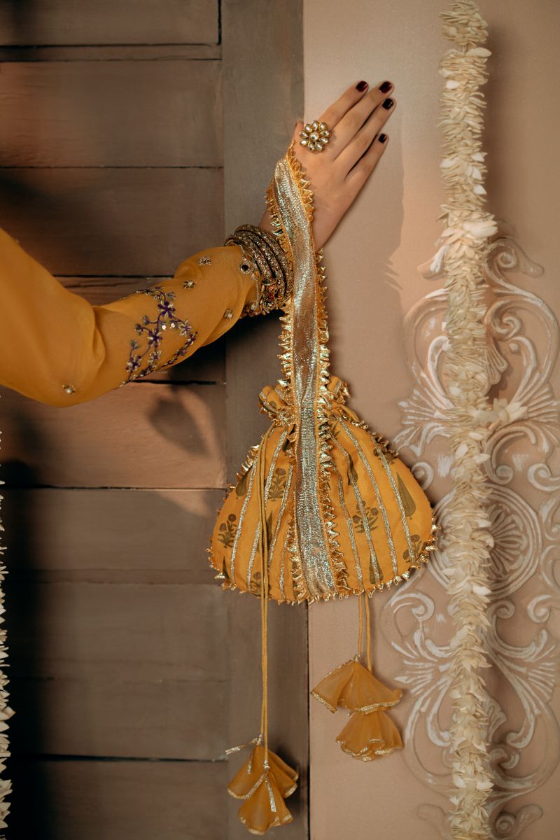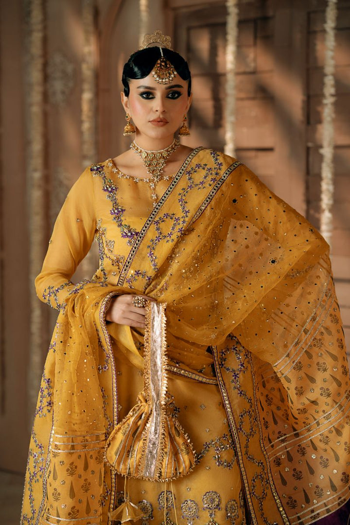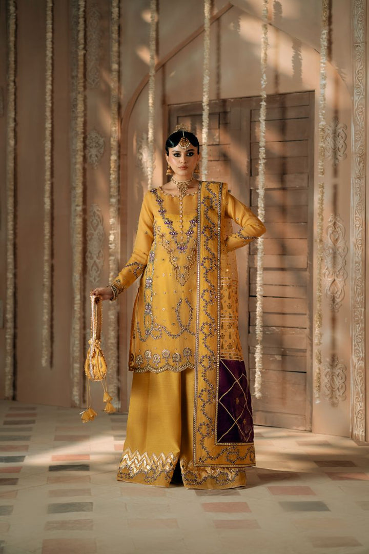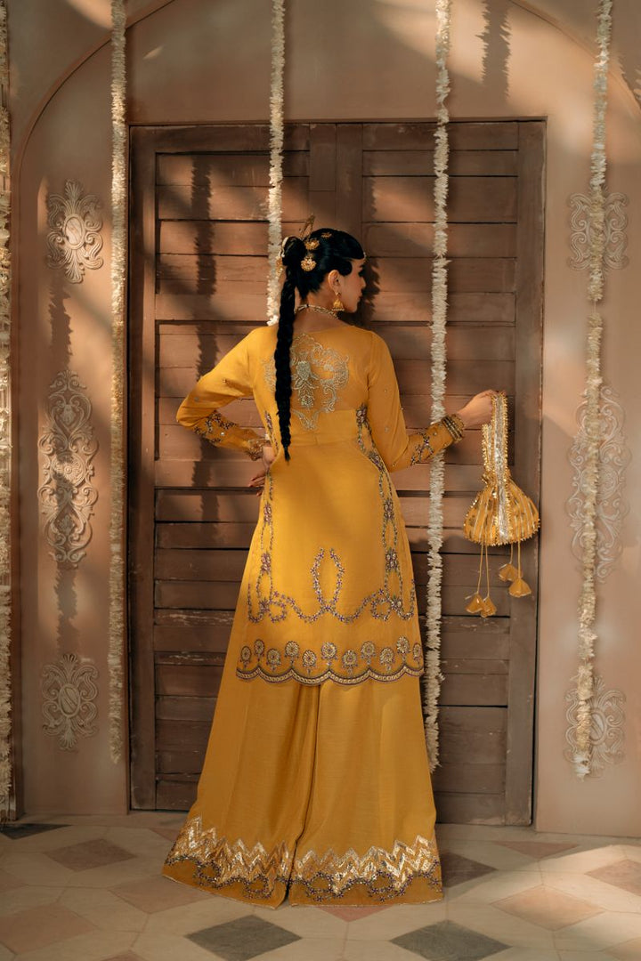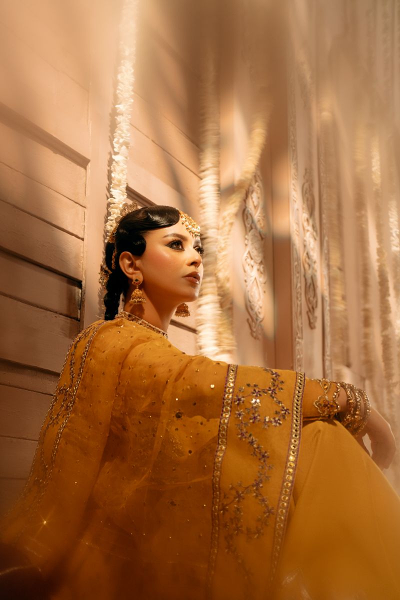 This exquisite mustard and plum ensemble is a timeless blend of vibrant color and traditional craftsmanship. The mustard shirt is richly adorned with intricate tilla work, featuring delicate metallic thread embroidery . Accents of plum thread and sequin detailing add depth and contrast, enhancing the regal feel of the design. The silhouette is classic yet graceful, perfect for festive and formal occasions. Paired with a beautifully flared mustard sharara, the outfit strikes the perfect balance between bold and elegant. The sharara is subtly embellished to complement the heavily worked shirt without overpowering it. Completing the look is a luxurious dupatta in sheer fabric, bordered with elaborate tilla embroidery and scattered motifs throughout, giving it a rich, heirloom-quality finish. This ensemble radiates sophistication, making it ideal for weddings, engagements, or festive gatherings. 4 piece embellished shirt with sharara, inner and heavy dupatta., Top fabric: Organza Bottom fabric: Pk silk Inner fabric: Pk silk Dupatta fabric: Organza.
