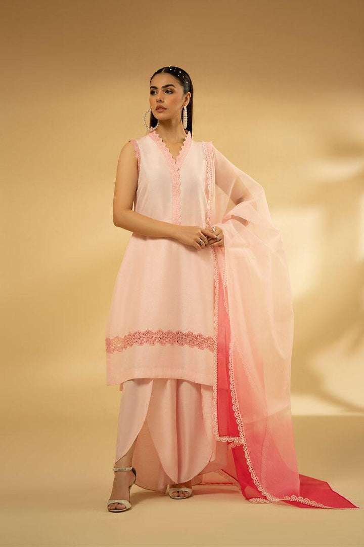 Completing the look is an ethereal Organza dupatta with a beautiful gradient effect and a lace finish, reminiscent of cascading petals. The loose flared tulip trouser ensures both comfort and style.