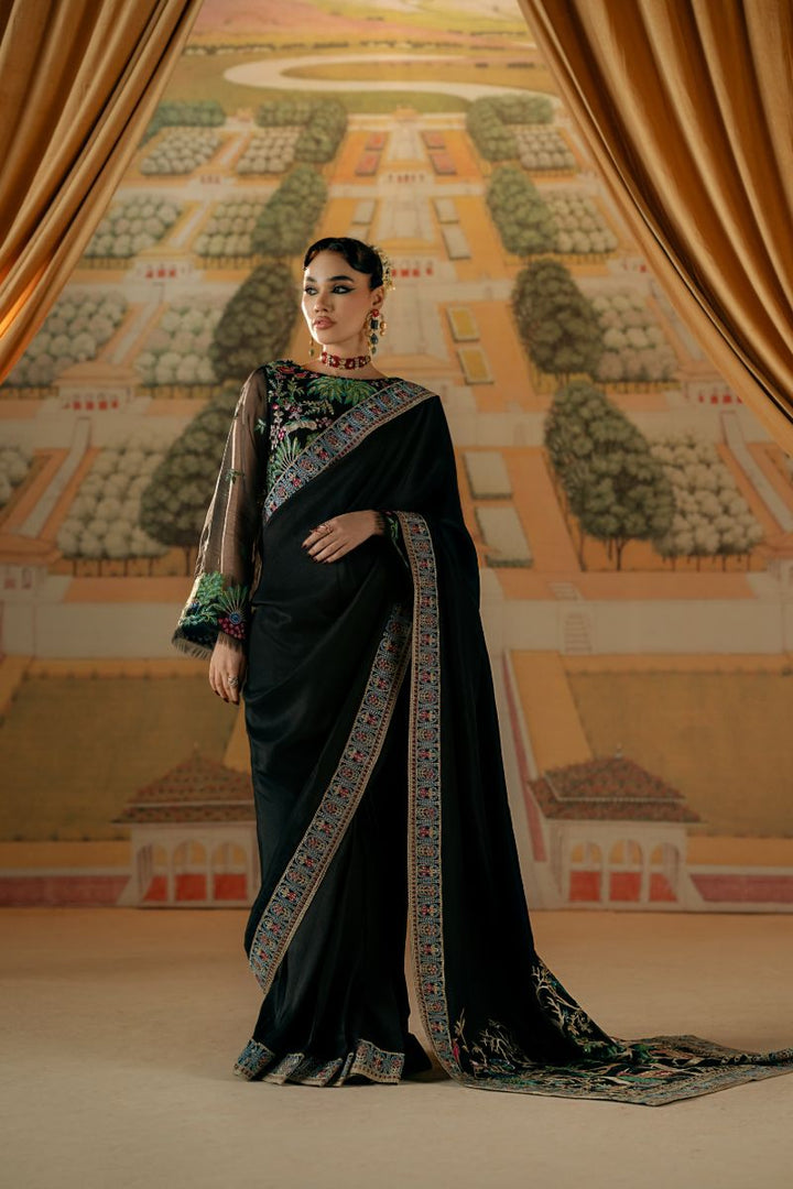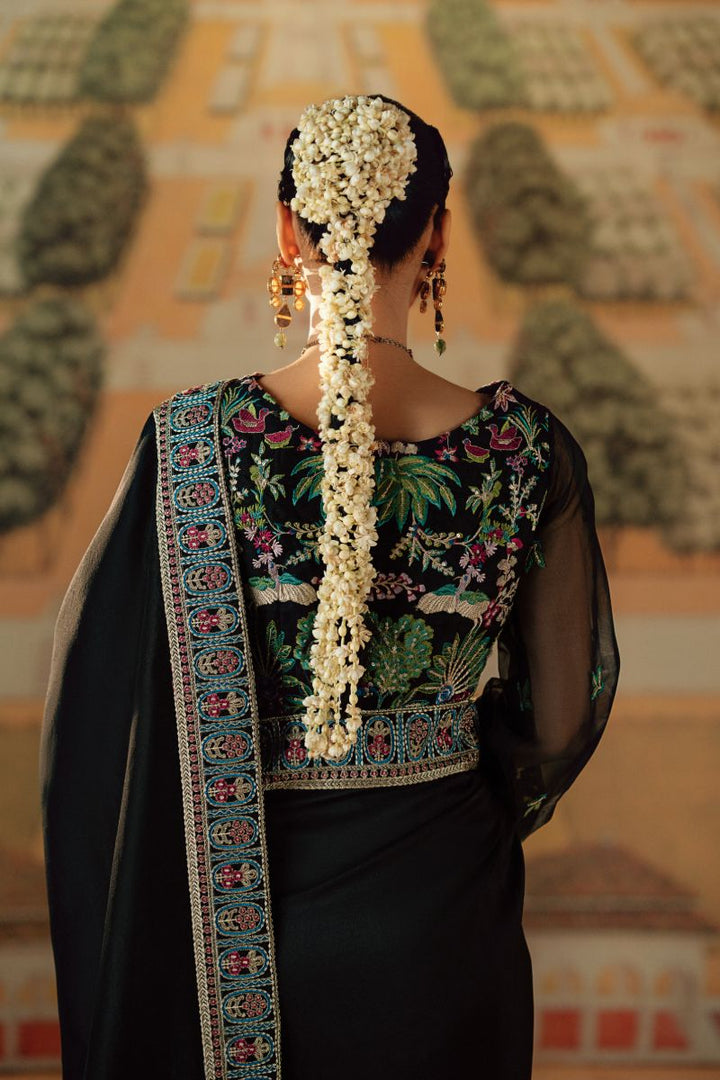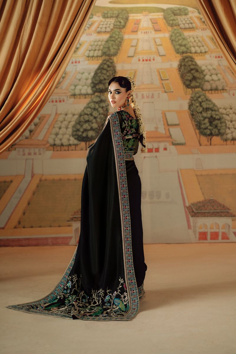 This elegant ensemble features an exquisite black PK silk saree paired with a beautifully embellished blouse. The saree's luxurious black hue drapes gracefully, exuding sophistication and timeless charm. The blouse is intricately adorned with delicate embroidery, featuring shimmering beads, sequins, and intricate threadwork that catch the light with every movement. The combination of the opulent, lustrous fabric of the saree and the detailed embellishments on the blouse creates a striking contrast, elevating the entire look. Perfect for a formal evening, wedding, or any special occasion, this outfit radiates glamour, tradition, and modern elegance. 3 piece embellished saree with blouse and underskirt., Saree fabric: Pk silk Blouse fabric: Organza Inner fabric: Pk silk