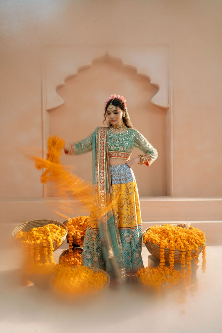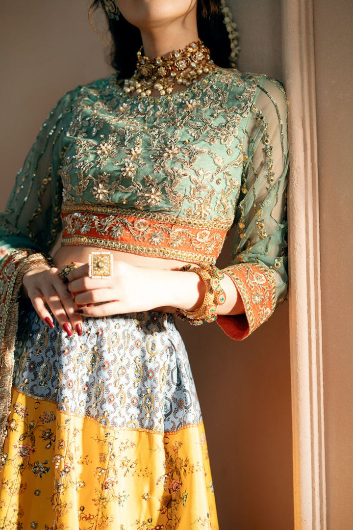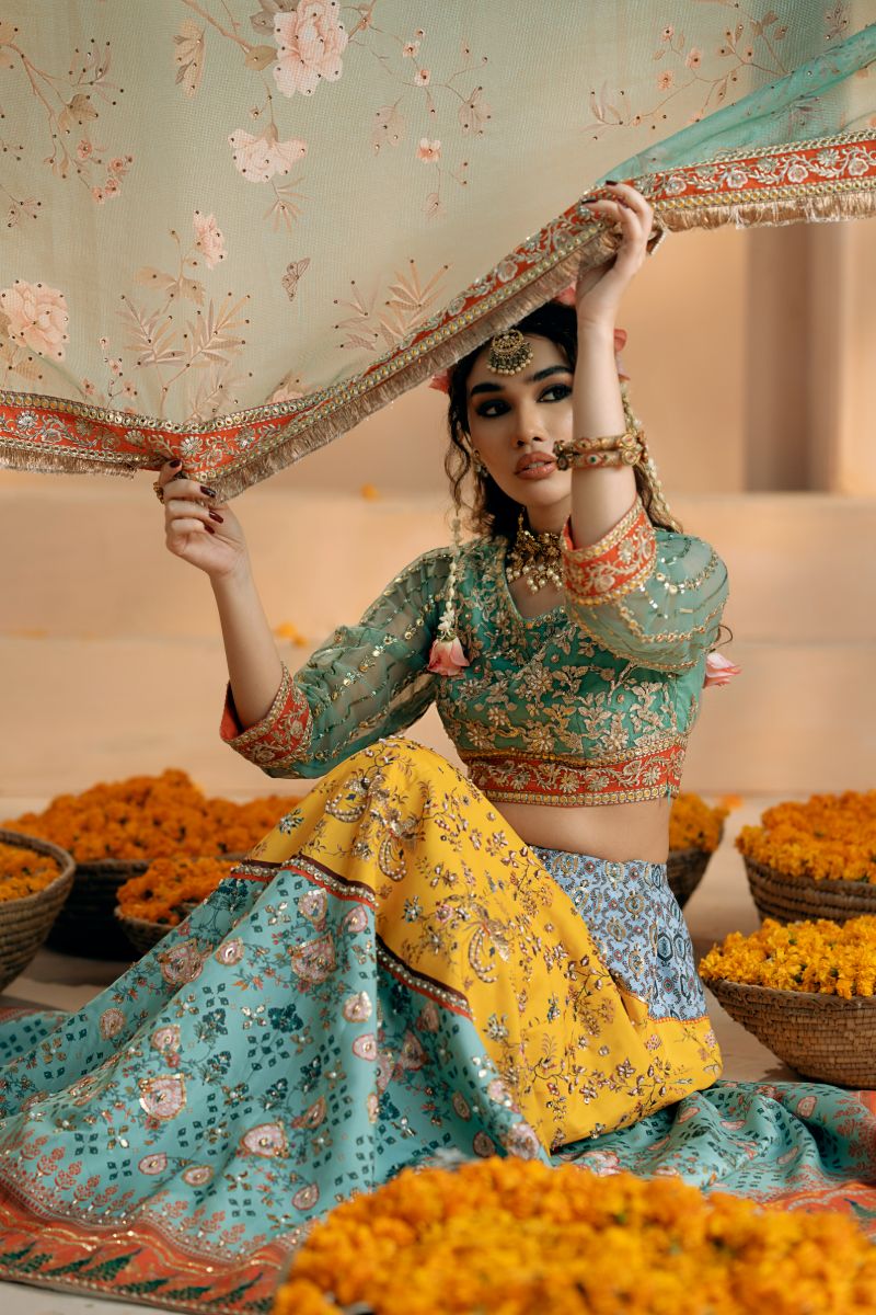 Radiate elegance and festive charm in our C-Green, Yellow, and Orange Embellished Lehenga, designed to make a statement at any celebration. The lehenga features a vibrant mix of colors — rich C-green, bright yellow, and warm orange — each thoughtfully blended to create a striking, joyful effect. Adorned with intricate embellishments including sequins, beads, and delicate embroidery, the lehenga shimmers with every movement, exuding a sophisticated yet playful allure. Paired with a rocket net dupatta, this ensemble offers a light, airy feel with sheer elegance. The dupatta is beautifully adorned with matching embroidery along the edges, completing the look with grace and fluidity. Perfect for weddings, receptions, or festive occasions, this lehenga is a celebration of vibrant colors, intricate craftsmanship, and modern elegance — an unforgettable addition to your bridal or occasion wear collection. 4 piece embellished lehenga with choli, dupatta and potli., Blouse fabric: Organza Lehenga fabric: Pk grip Dupatta fabric: Rocket net Inner fabric: Pk silk
