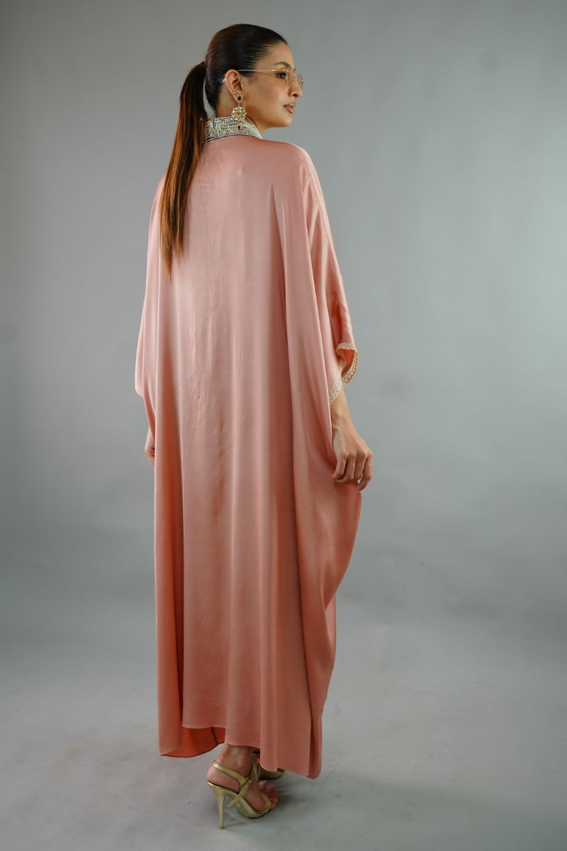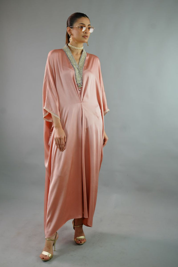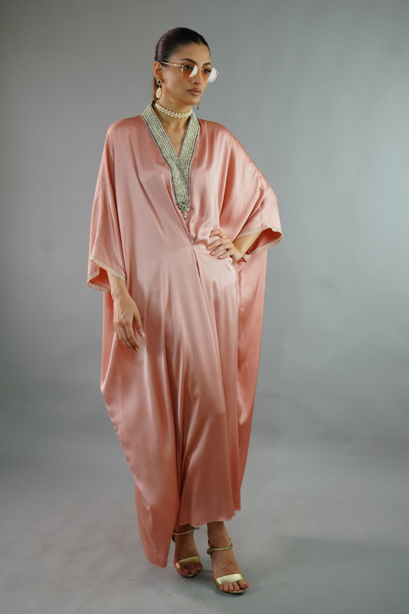 Luxurious silk Kaftan in luxe silk, beautifully draped and pleated at front, adorned with hand embellished collar. The Kaftan is trimmed with delicate lace at sleeve.