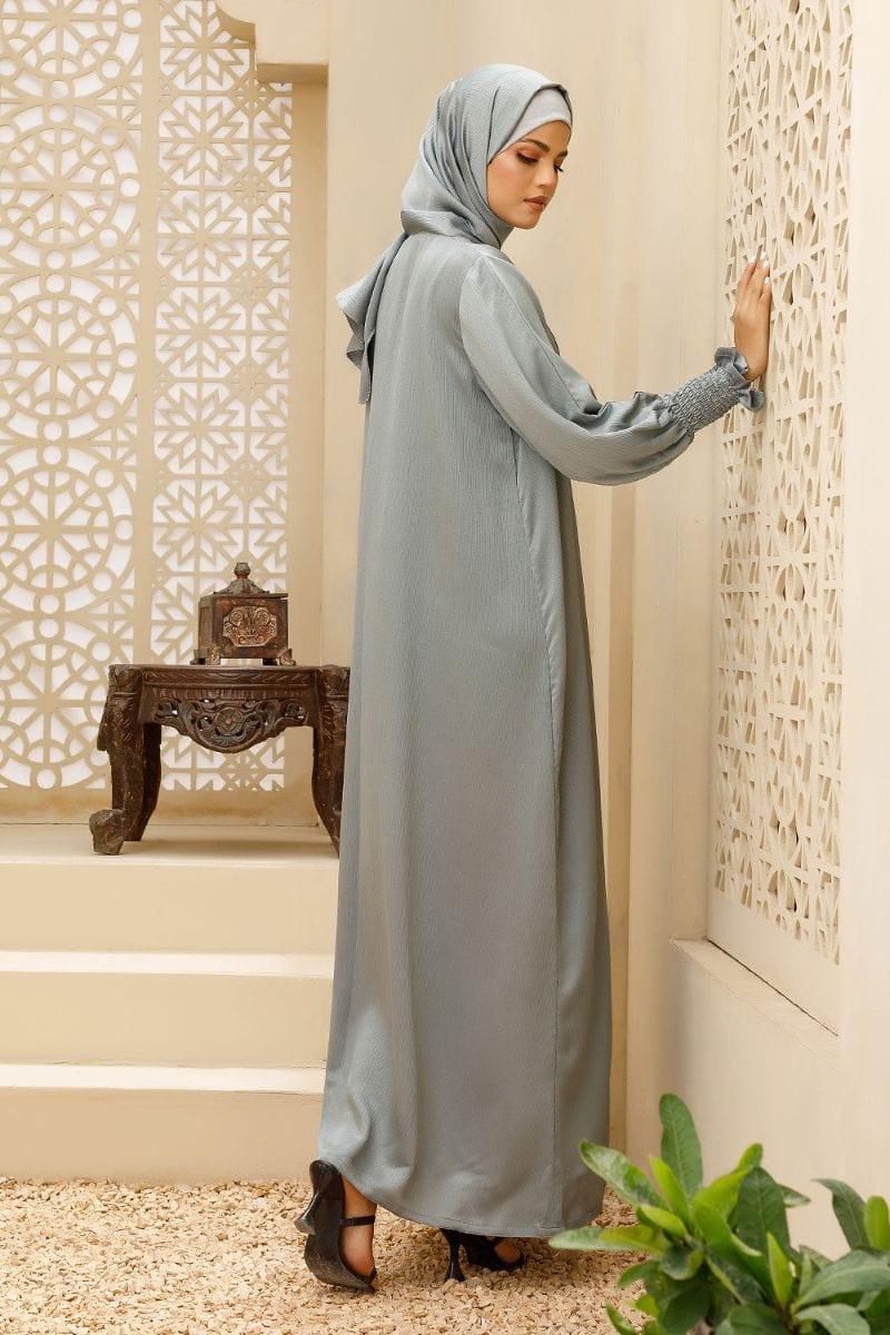 Hijabi - Smocked Sleeve Front-Open Abaya - Grey - Studio by TCS