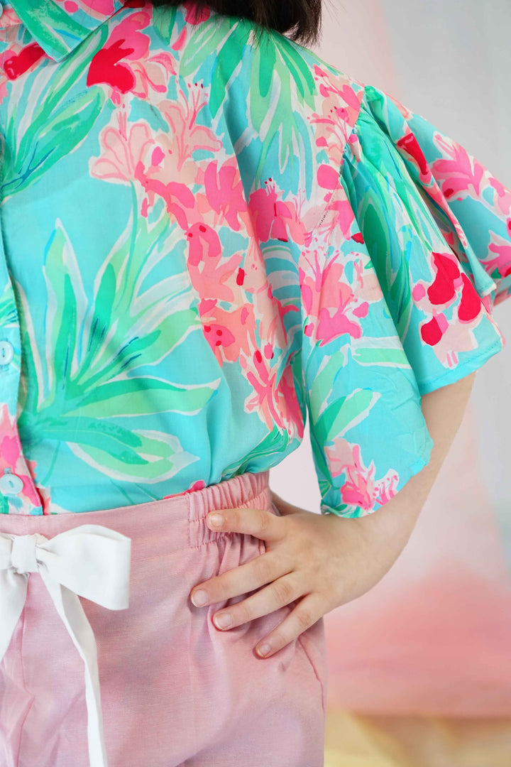 Adding some brightly coloured intrigue to your youngster’s summer wardrobe, Hummingbirds Kids always prioritises transitional tailoring, and this vibrant, Hibiscus pink floret print on a bright blue-green base fits the bill; the boxy silhouette, spread collar and dropped shoulders with the butterfly sleeves are all signs of a versatile piece made with contemporary style in mind.