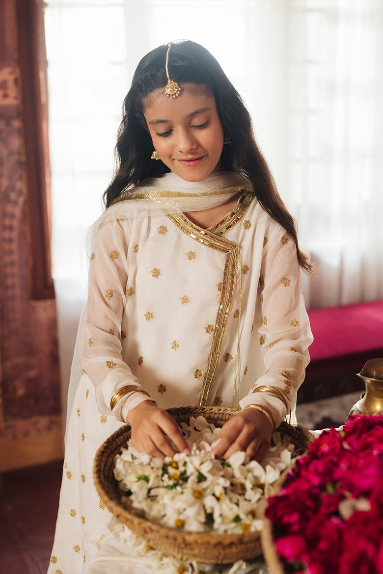 Inspired by the delicate beauty of the Nargis flower, this pristine white and gold ensemble is the epitome of grace and sophistication. The Angrakha-style A-line silhouette offers a dreamy, elegant look with effortless wearability.