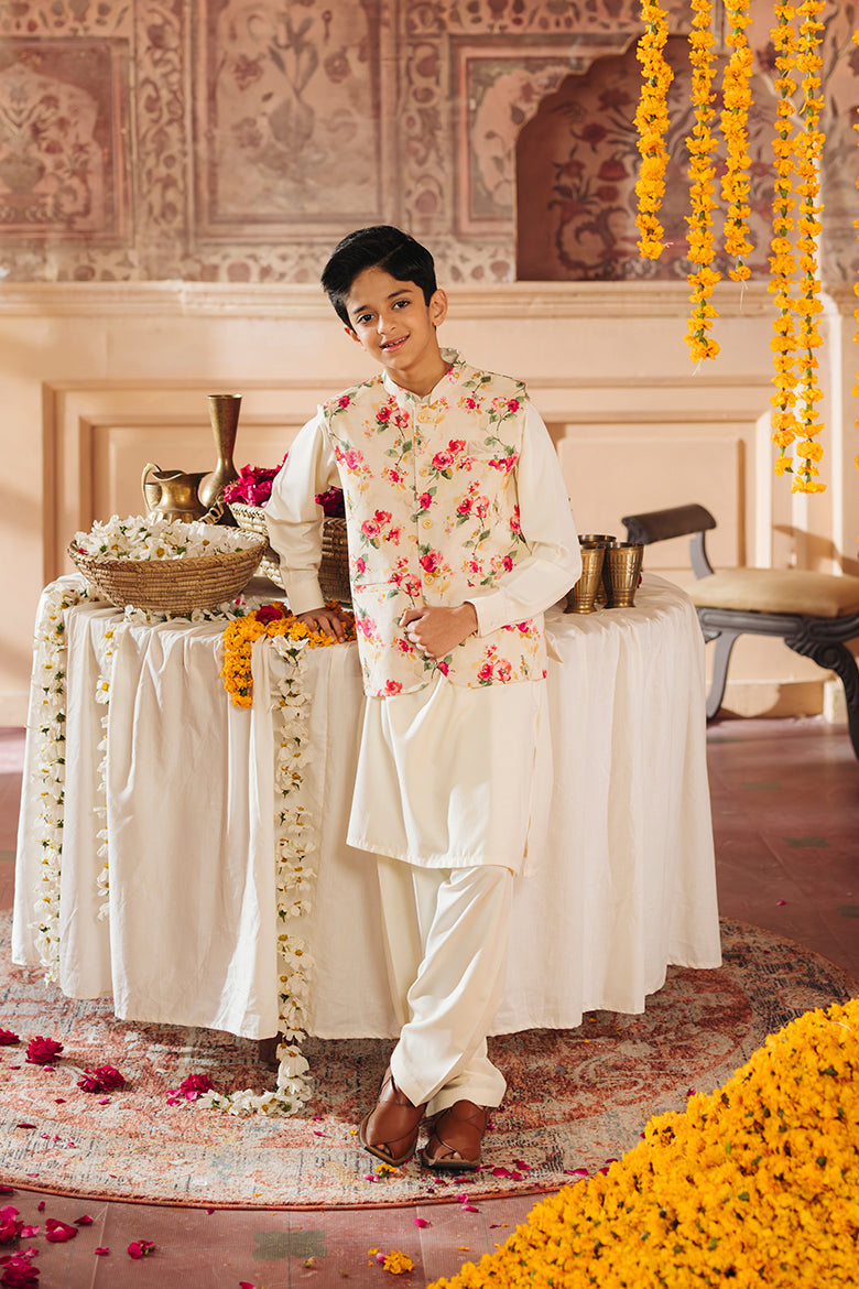 'The envy of the Garden' is how we describe this floral print waistcoat style. Imagined in pure lawn and lined with soft silk, it's indeed a sight for sore eyes. The print features a garden full of pink and peach flowers with lush green leaves all over against a cool cream background. The wooden buttons and silk pocket square adds elegance to the whole look. Ideally, it can be paired with our Cream boski suit or any pastel color kurta from our collections.