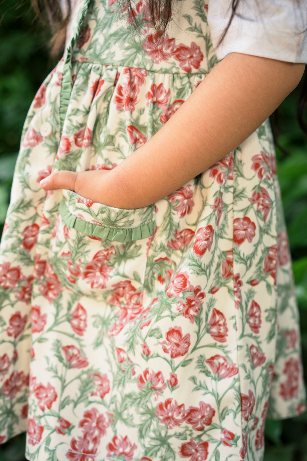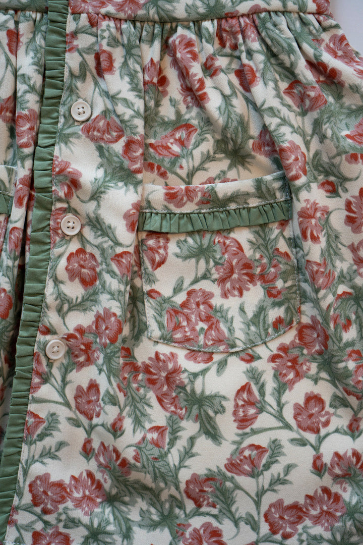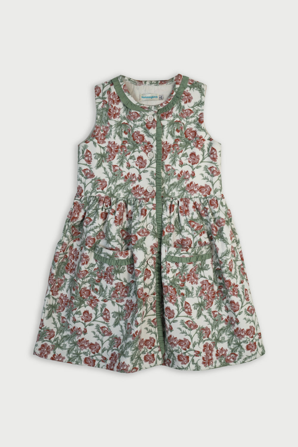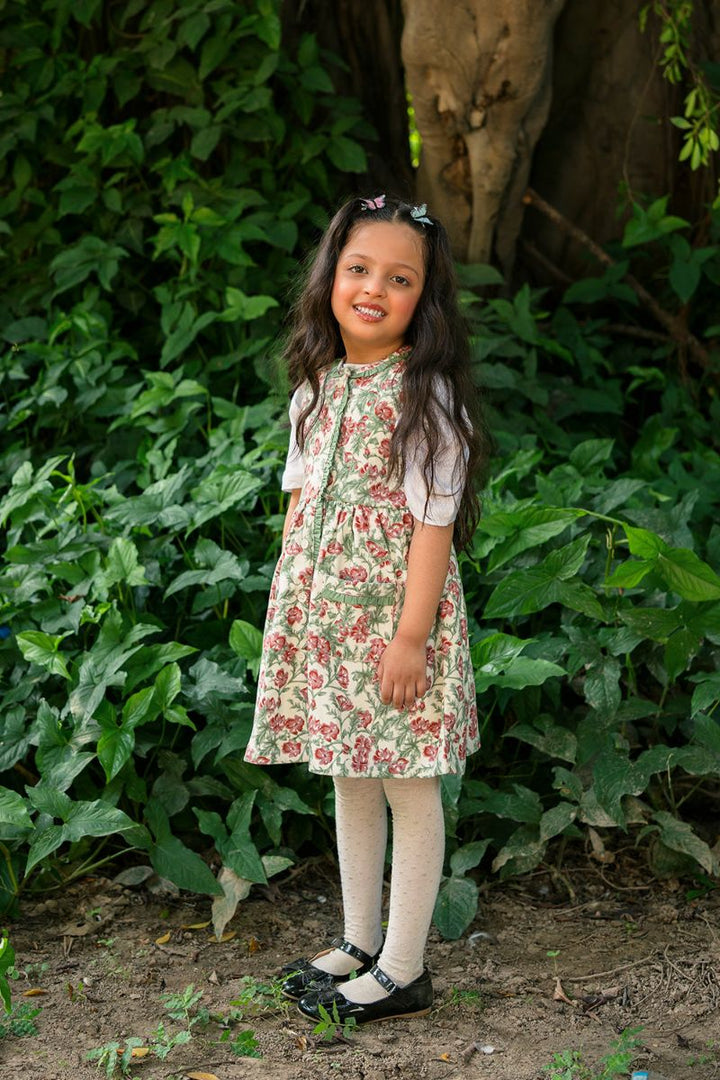 Welcome to the big, beautiful world of tiny little Thumbelina! She's small but so strong willed, she's clever and playful. She loves nature and surrounds herself with flowers. Your little doll will feel like she's living in our favourite book character's world where she can jump from one flower onto another! This lovely dress is imagined in a soft Corduroy fabric with a cream base and lovely pink florets printed all over. Sweet little moss green frills adorn the neckline, front opening, and the cute pockets on the front. The front opening is fastened with cream coloured buttons. Pair it with our Classic white Tee shirt or cream high neck to be worn underneath when it'd cold outside. A picture-perfect dress for your mighty little girl!