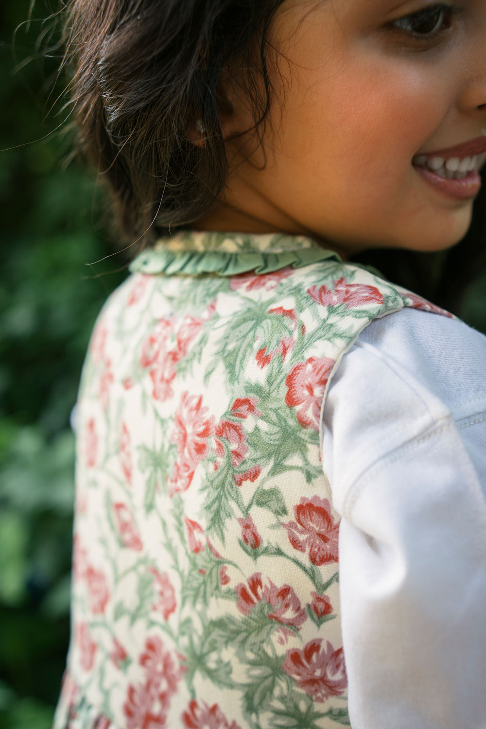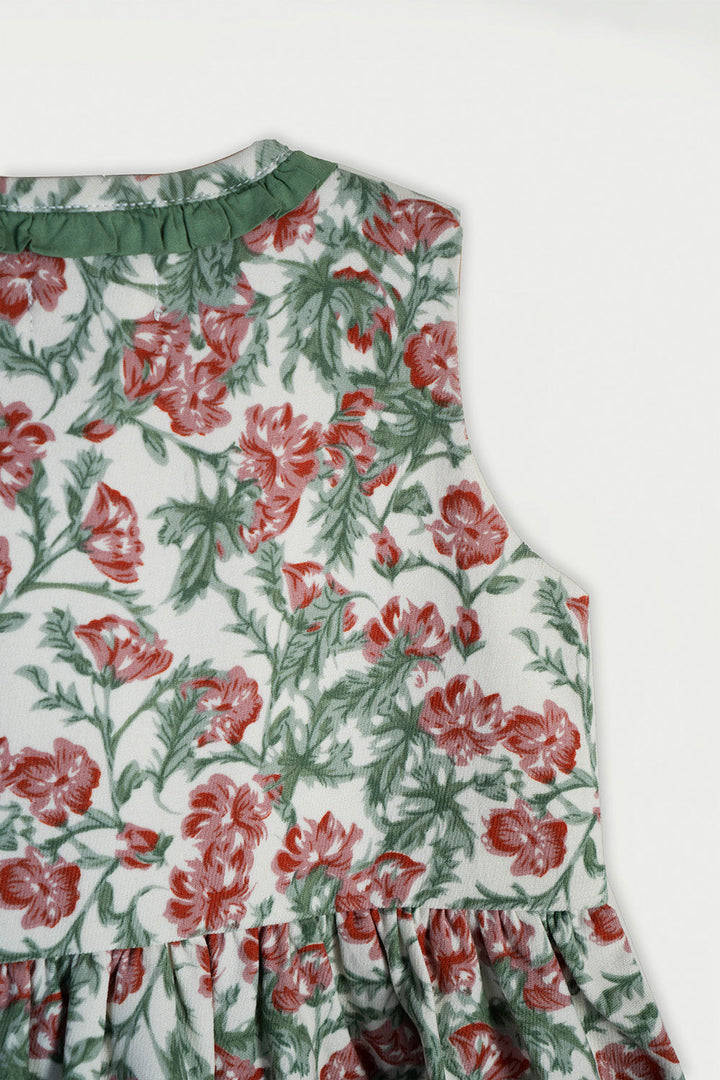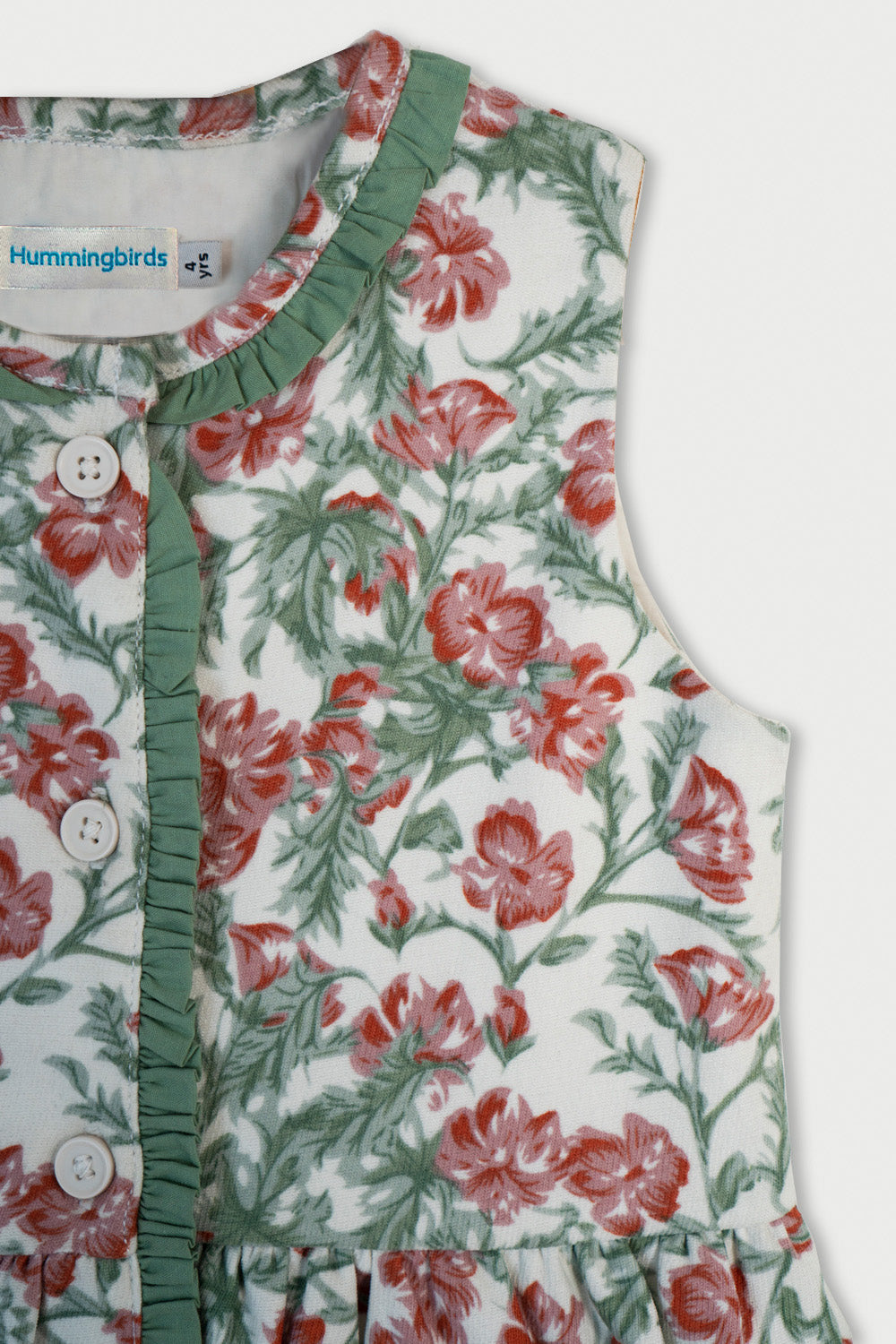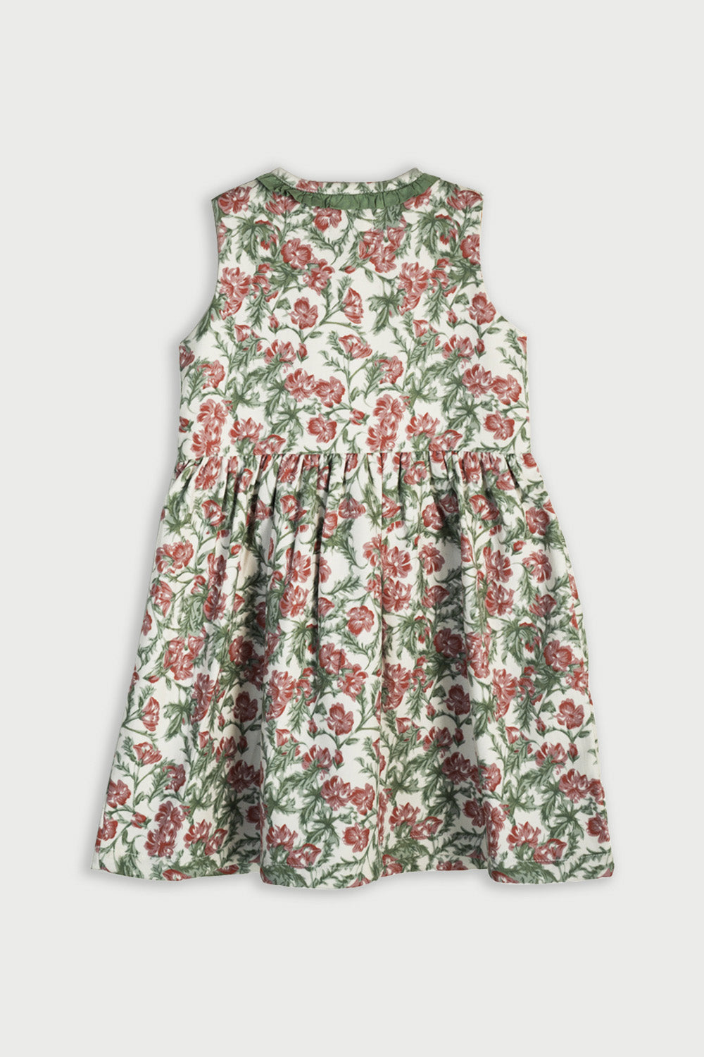 Welcome to the big, beautiful world of tiny little Thumbelina! She's small but so strong willed, she's clever and playful. She loves nature and surrounds herself with flowers. Your little doll will feel like she's living in our favourite book character's world where she can jump from one flower onto another! This lovely dress is imagined in a soft Corduroy fabric with a cream base and lovely pink florets printed all over. Sweet little moss green frills adorn the neckline, front opening, and the cute pockets on the front. The front opening is fastened with cream coloured buttons. Pair it with our Classic white Tee shirt or cream high neck to be worn underneath when it'd cold outside. A picture-perfect dress for your mighty little girl!
