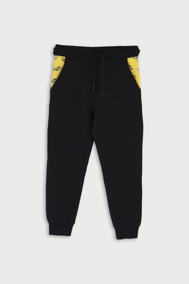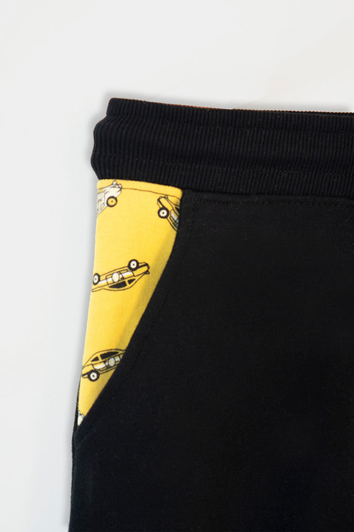 Zoom zoom zooomm! Here we go in our sports car! Inspired by the famous Cars cartoon, we this soft yellow and black car print fleece sweatsuit from our latest winter collection. Imagined in the softest possible cotton fleece fabric, this is a 2 piece style with a crew neck shirt featuring the cars print on a canary yellow base and contrasting back sleeves.The pull-up sweat pants feature the print inside the pockets while the rest is black. It has a an elasticated waist and hem for maximum comfort! Your little adventurous one is sure to love this fun and cosy outfit!