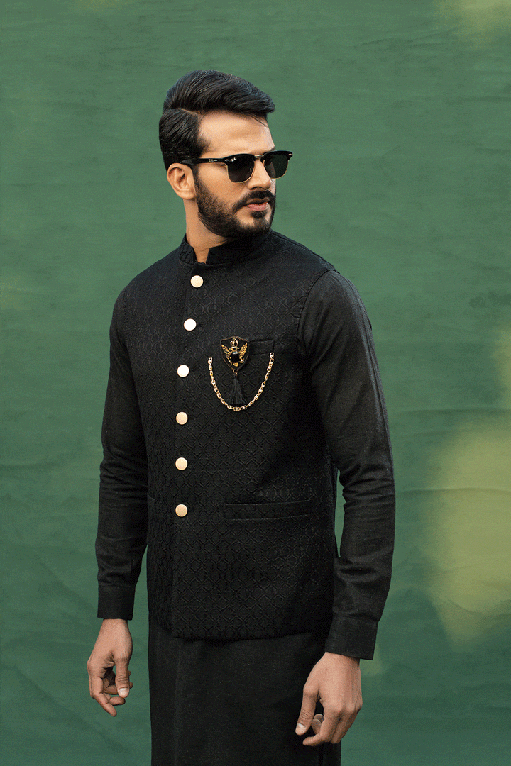 A black waistcoat is forever. This timeless black waistcoat is styled with the classic gold buttons to add the perfect finishing touch. Pair this black self embossed waistcoat with our black kurta pajama set.