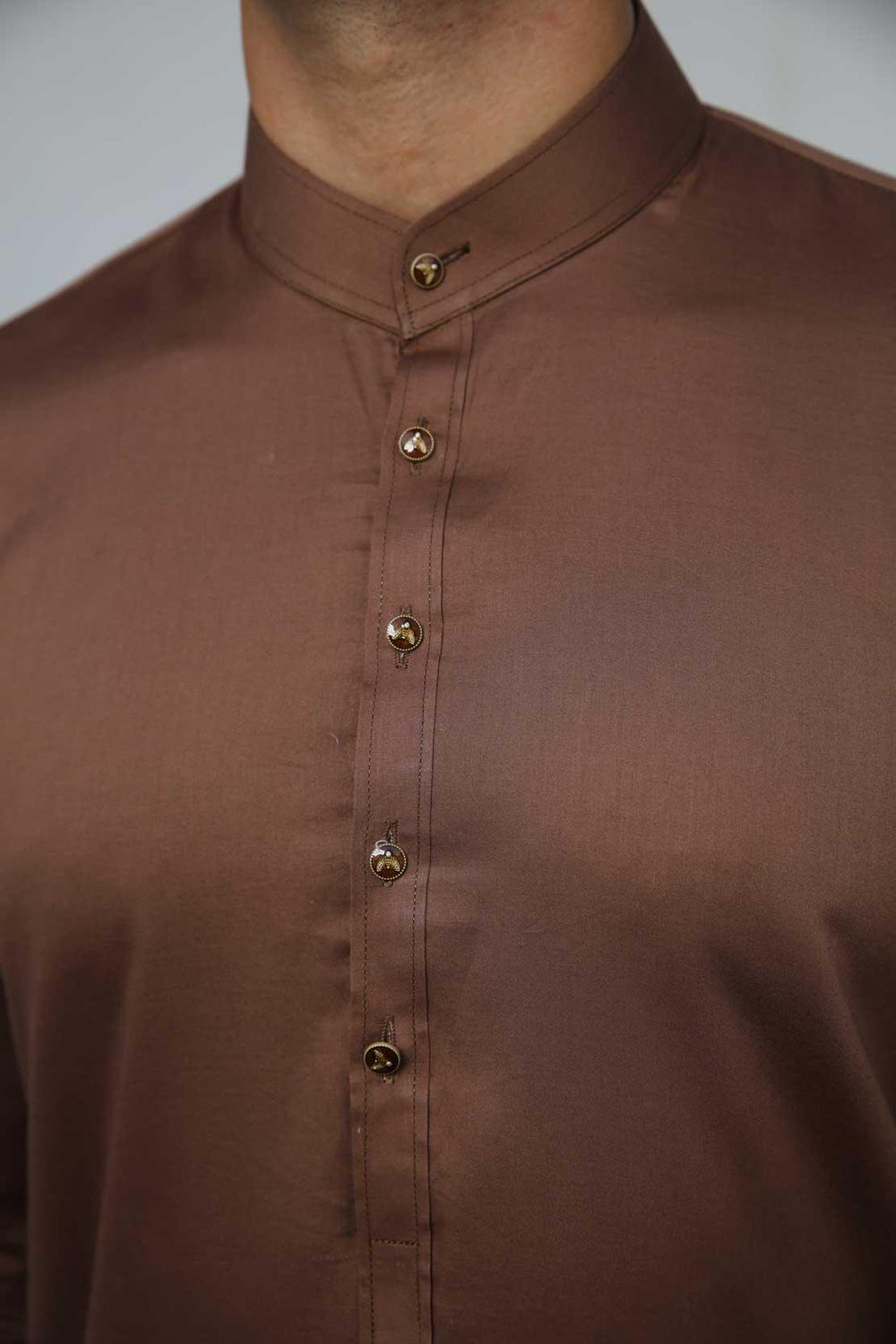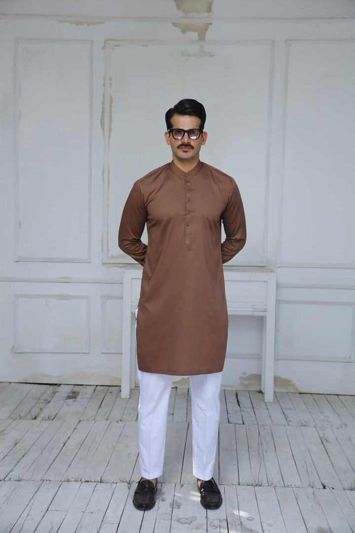 This chocolate brown kurta trouser set is made from pure pima cotton blend with a light starch finish. The classic kurta has a band collar has four custom brown and copper metal buttons to finish the look. The kurta has plain straight sleeves with buttoned cuffs and the white cotton trouser is also a straight cut with side pockets.