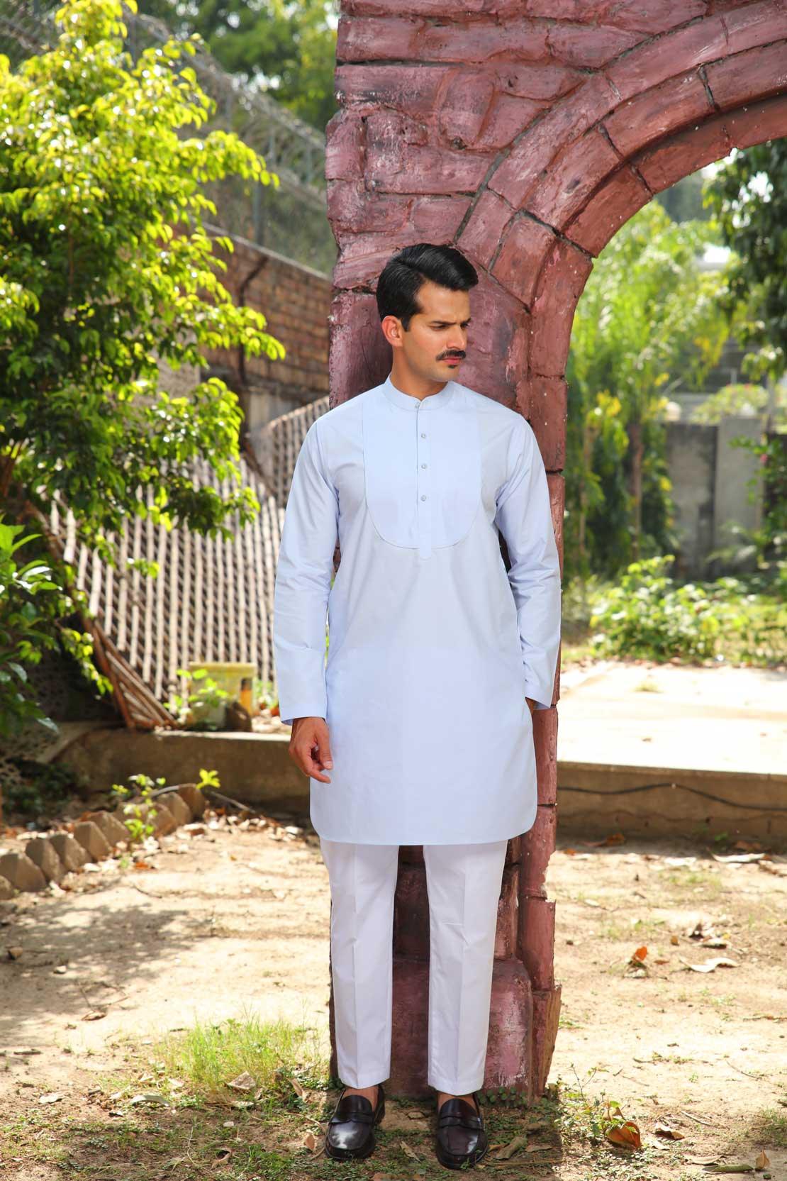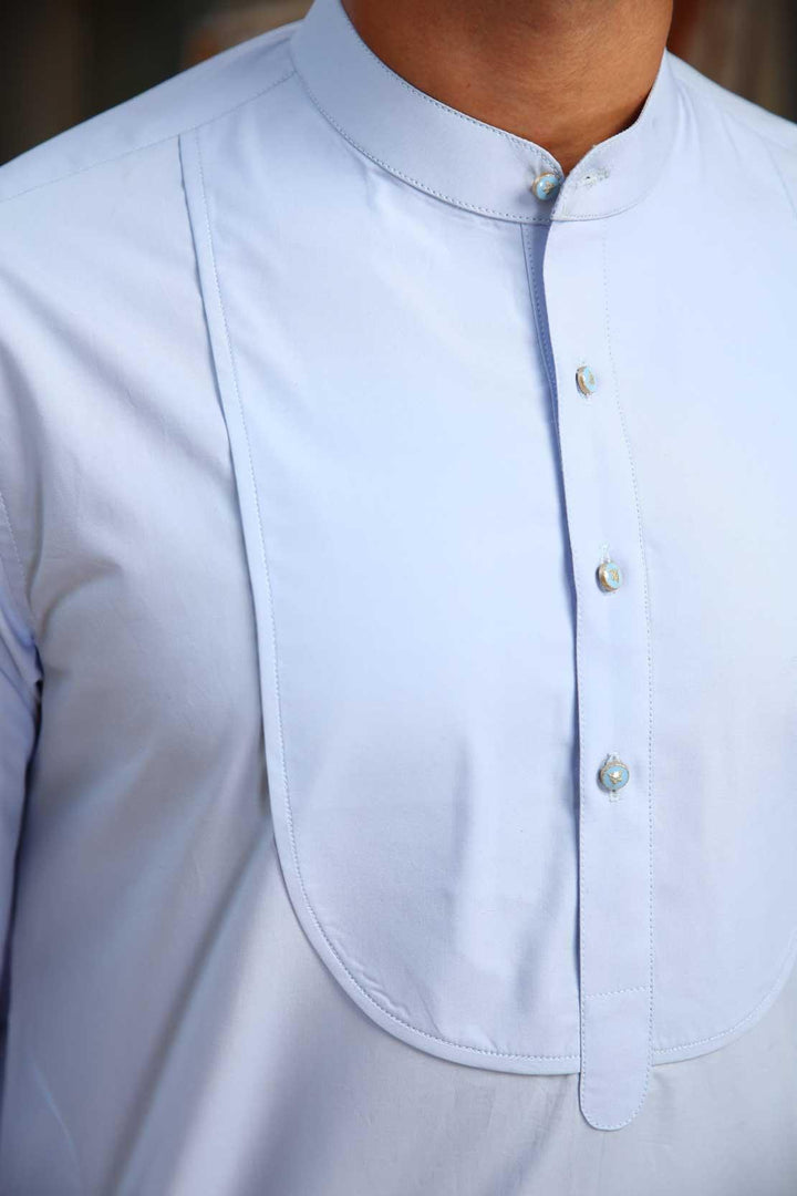 This powder blue kurta trouser set is made from pure pima cotton blend with a light starch finish. The classic kurta has a band collar with a paneled neckline has four blue custom metal buttons with hints of gold to finish the look. The kurta has plain straight sleeves with and the white cotton trouser is also a straight cut with side pockets.