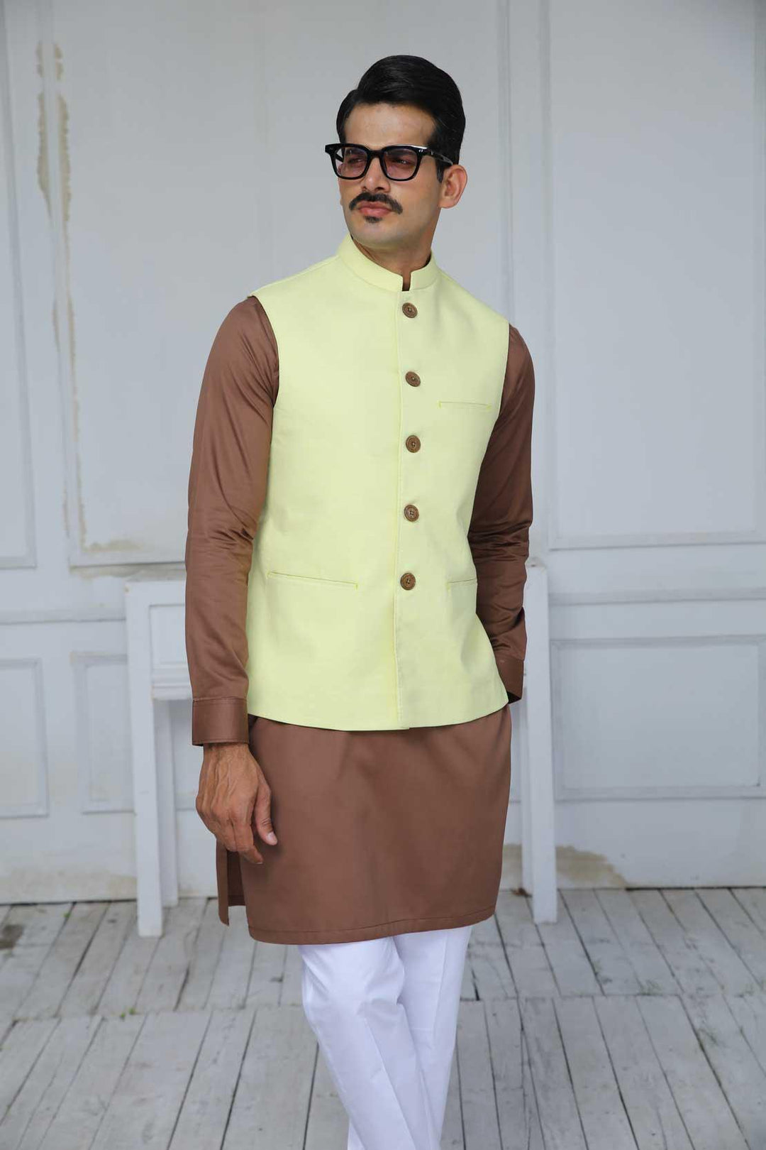 This lemon yellow irish linen waist coast is hand made with a classic band collar and stitching details run across the five custom marbled wood buttons. There is one pocket on the top right while two pockets on each side on the waist line finished neatly with a piping finish.