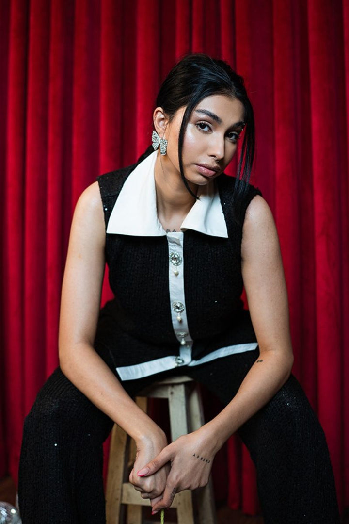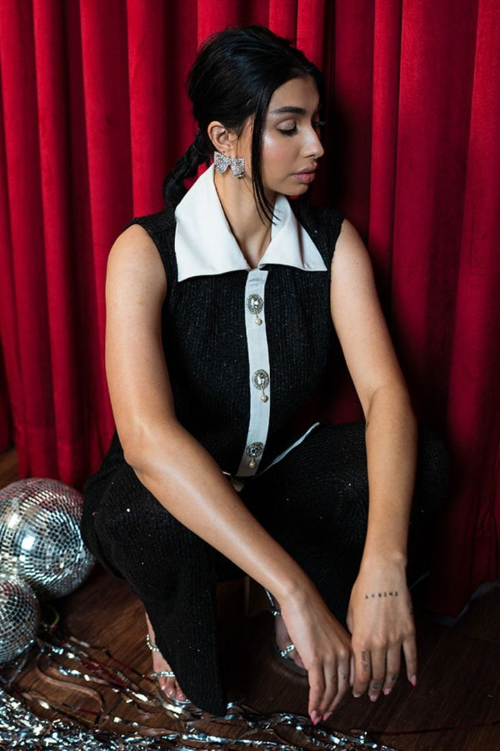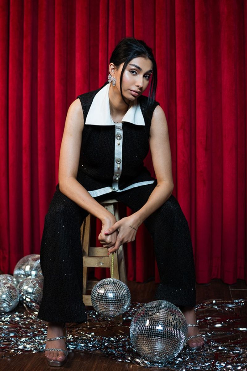 Veronica, a 2 pc co-ord set, featuring a sleeveless top and wide-legged trousers adorned in sequins. The black-and-white contrast combined with the soft jersey fabric allows Veronica to shine while offering supreme comfort, perfect for upscale gatherings and evening celebrations. For those who love to dazzle with understated elegance, Veronica brings a balance of chic style and effortless wearability.