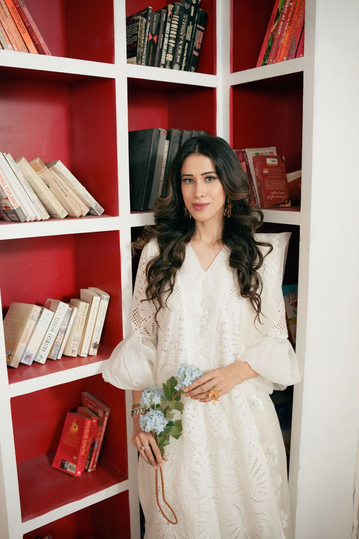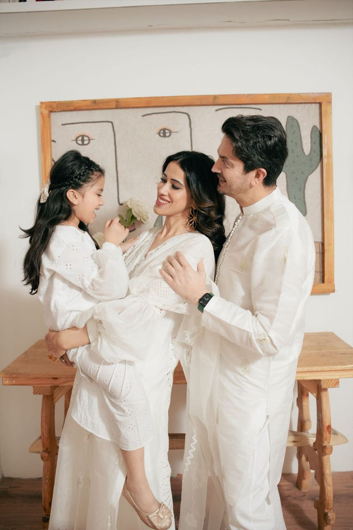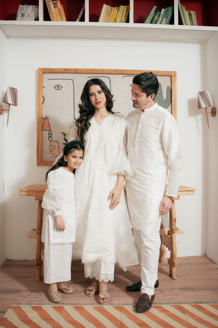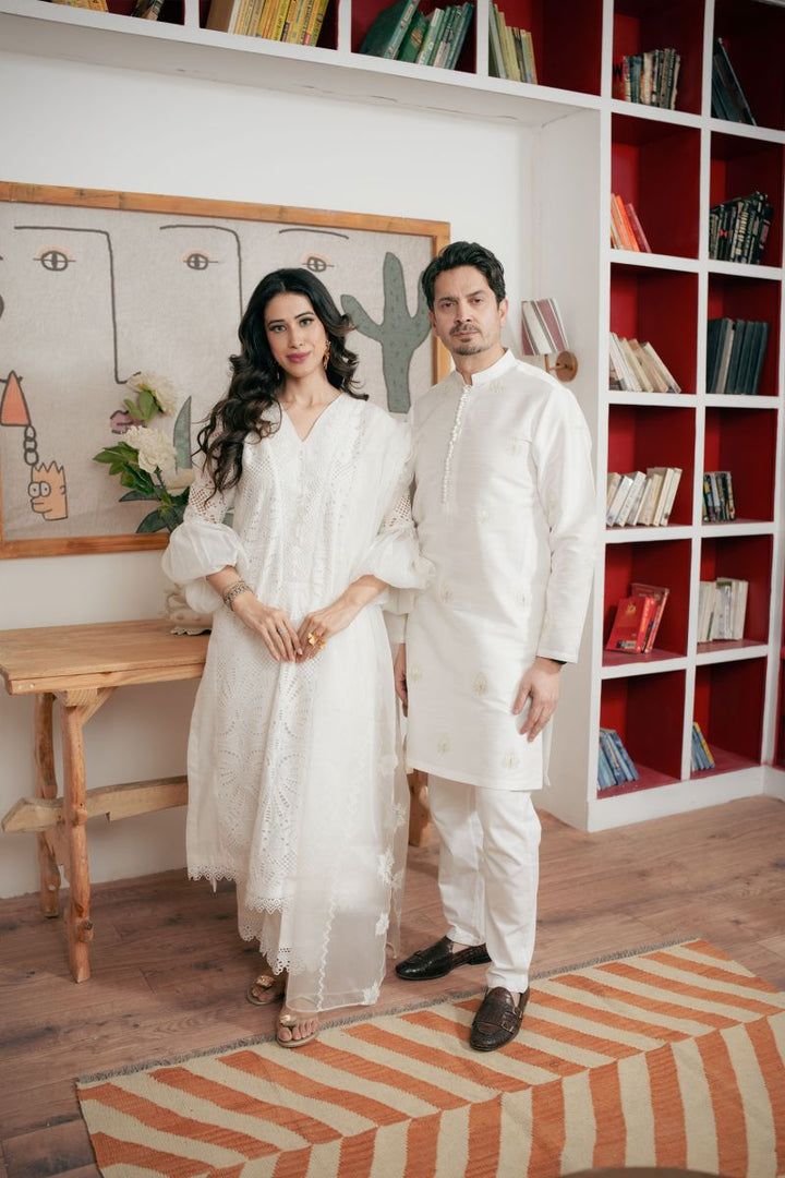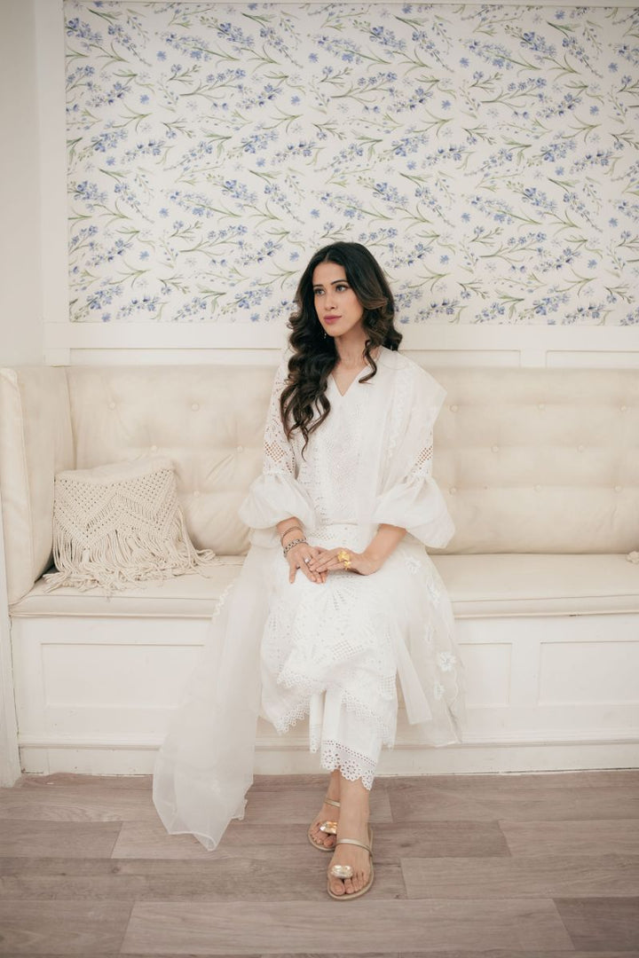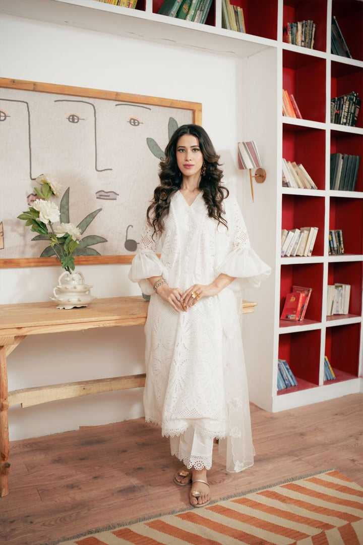 Jasmine White Fabric: Chikankari with Paper Cotton panel Details: Long shirt, chikankari embroidery, paper cotton panels, with organza dupatta, Straight pants with embroidery details Jasmine White is a vision of timeless grace featuring a long chikankari shirt with soft paper cotton panels and back. Paired with a matching embroidered organza dupatta with palazzo pants with Chikan details, it’s an effortlessly elegant look for festive day occasions or serene formal evenings. A wardrobe classic in pure white.