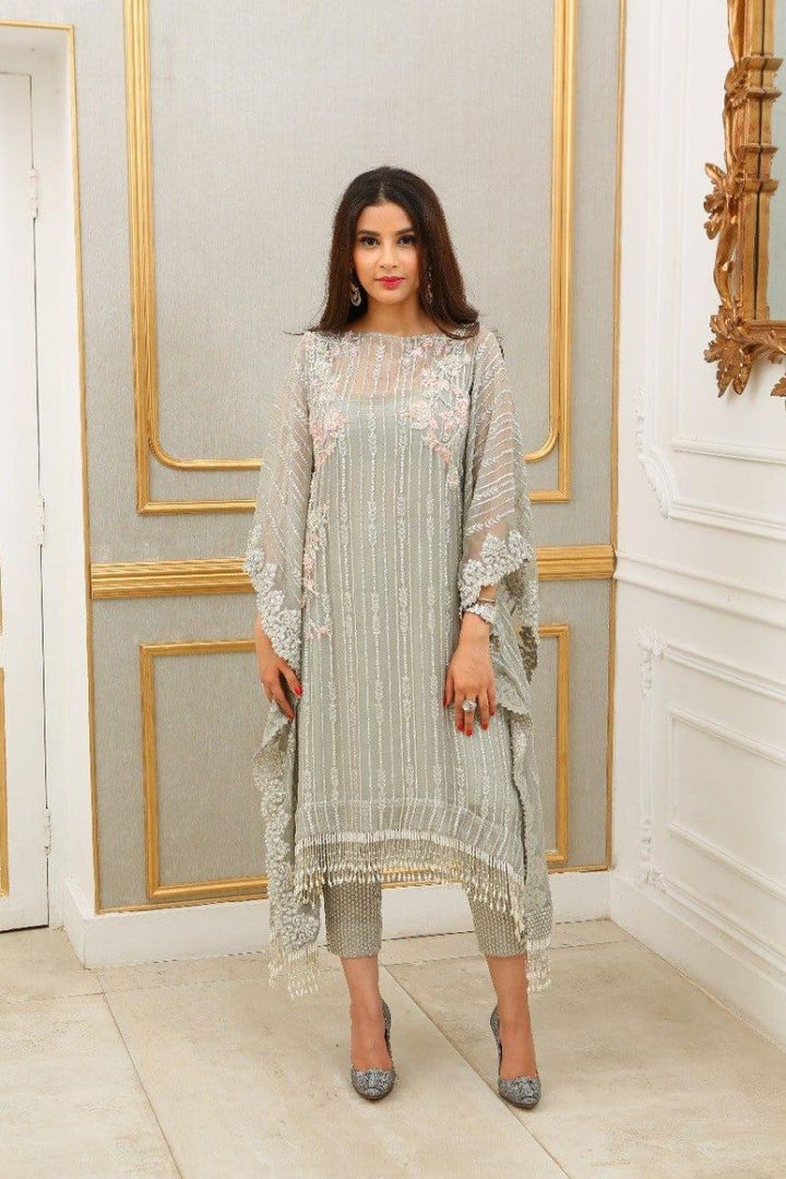 Color: Grey Includes: Shirt, Pants Shirt: Embroidered Chiffon includes Kora Dabka and Sequence work Pants: Embroidered Organza