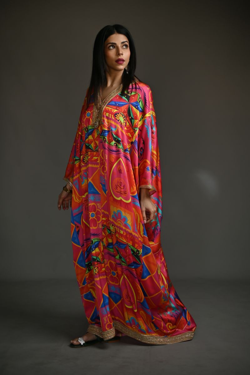 Featuring our exclusive truck art inspired print, this Kaftan is a must have. Adorned with a gold lace neckline, the Kaftan is delicately trimmed with lace on sleeves and hem. A splendid brooch on the neck completes the look.