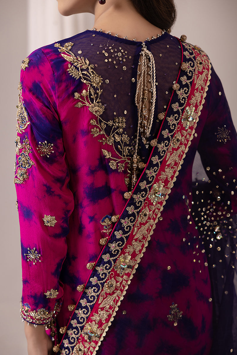 Description: An alluring tie and dye outfit adorned with amazing embroidery, intricately embellished with sequins, tilla, naqshi, crystals ,stones ,pearls and a fusion of pink and plum threads. The ornate design creates a mesmerizing effect.