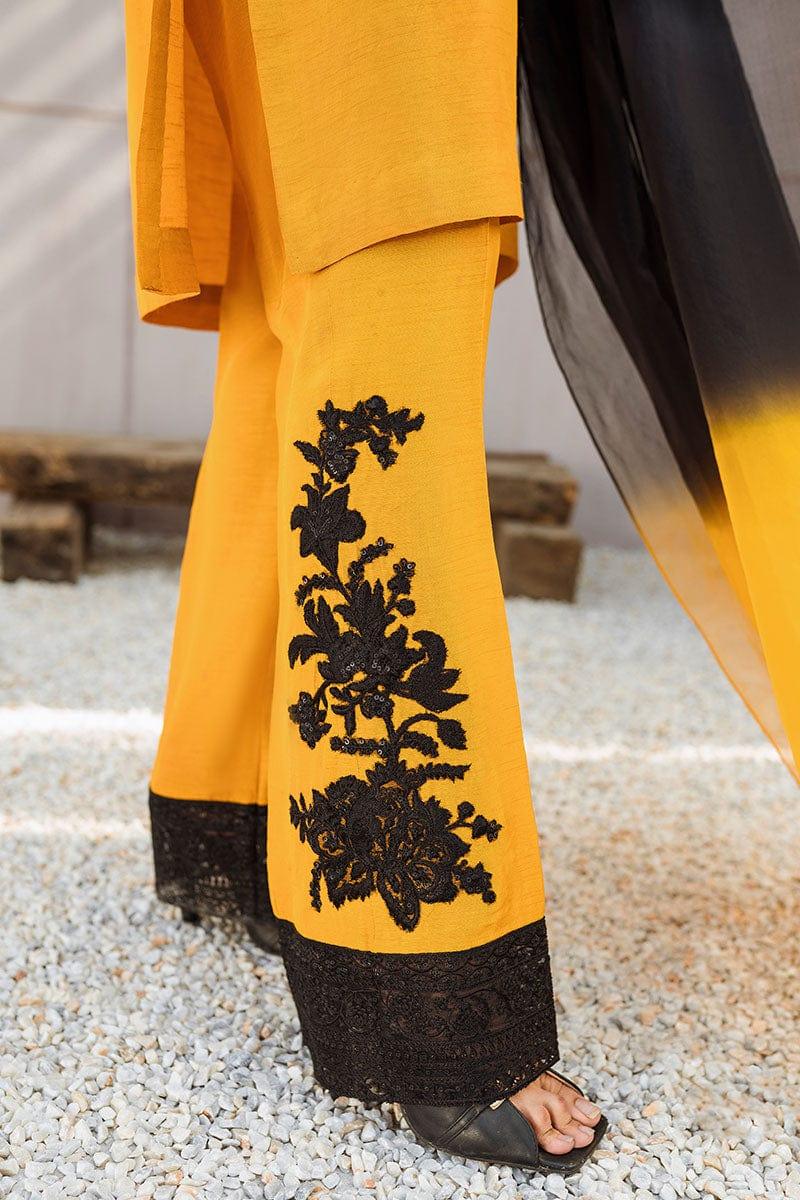 Dreamy and ethereal outfit – this mustard raw silk shirt and trouser comes with an organza dupatta. The shirt is adorned with delicate adda work. The trouser with embroidered patch work adds to the ode of this ensemble. The organza dupatta is dyed on ombre’ black and mustard and is laced up with delicate edging. This remarkable piece is bound to make you the center of attention.