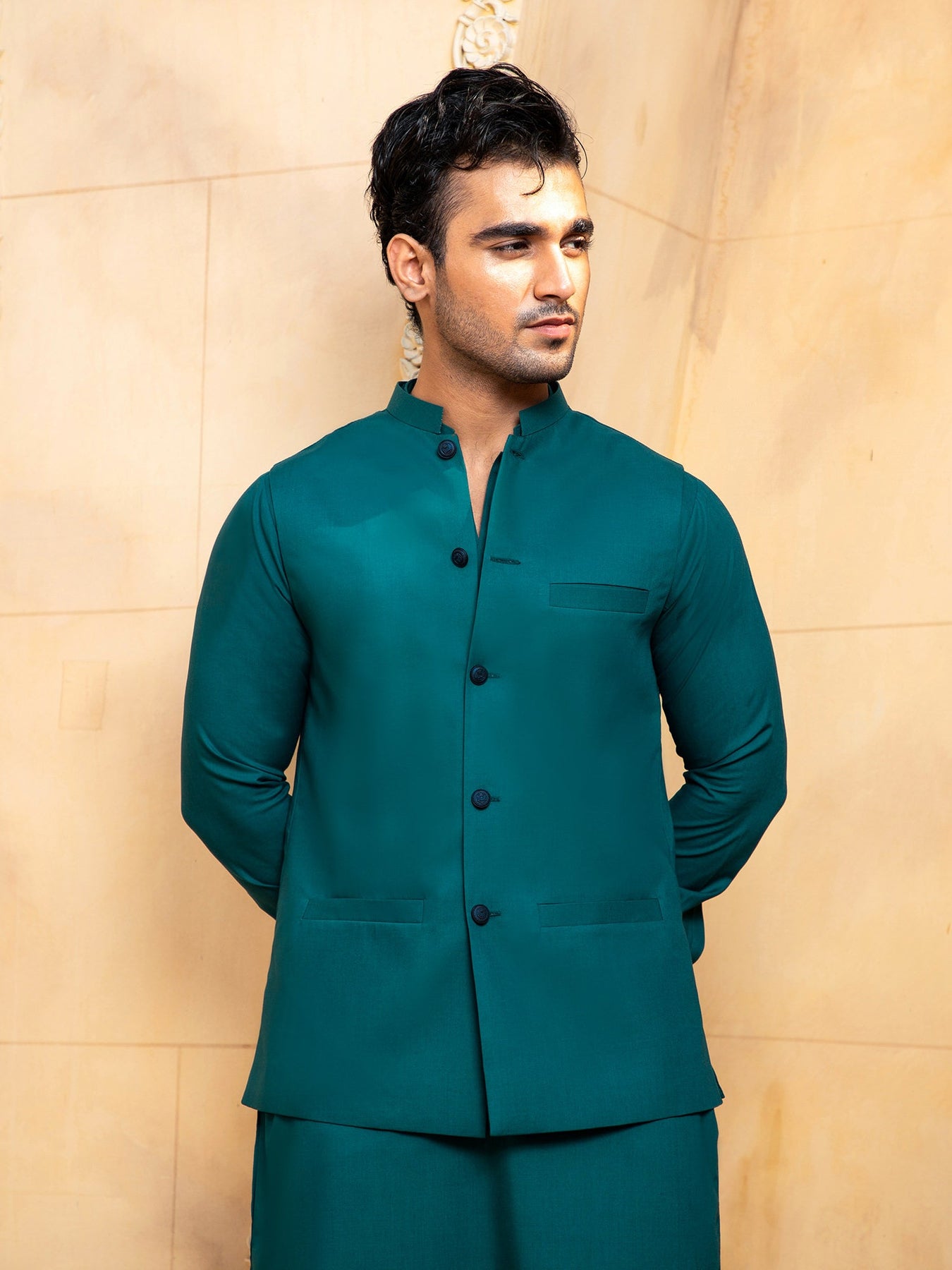 Description: Crafted from premium wash & Wear Fabric, Features a classic Kurta, Matching straight trousers and a traditional, matching waistcoat. This is a 3 piece stitched outfit.