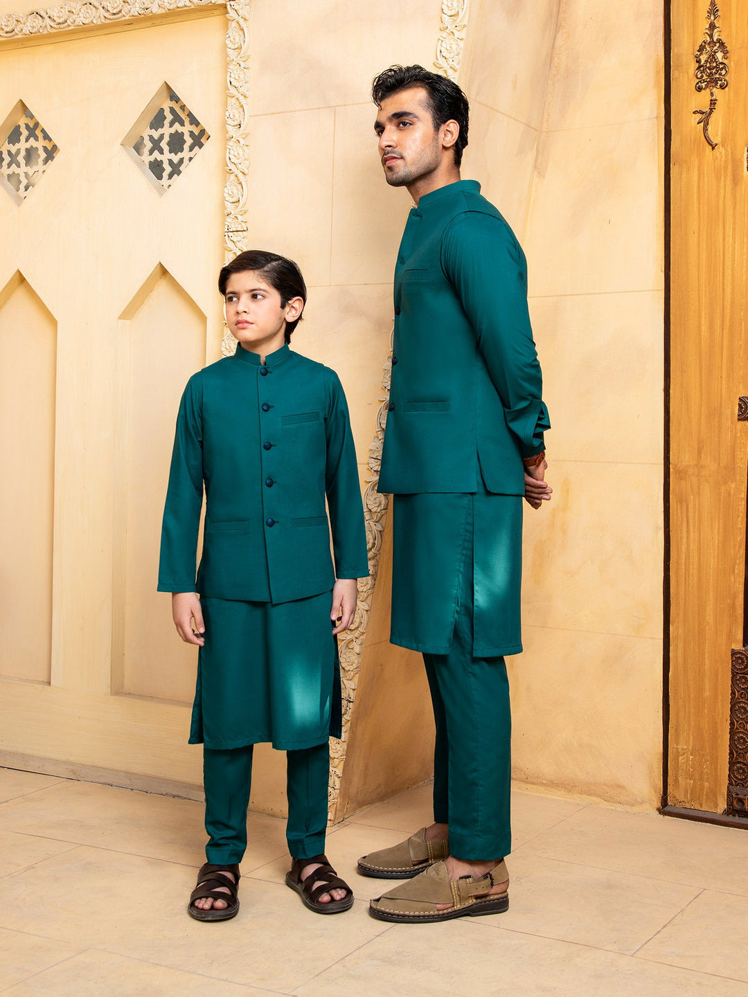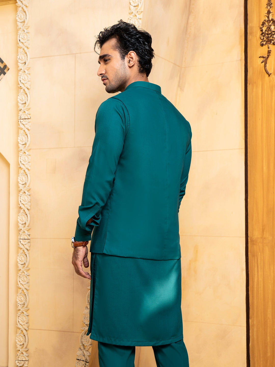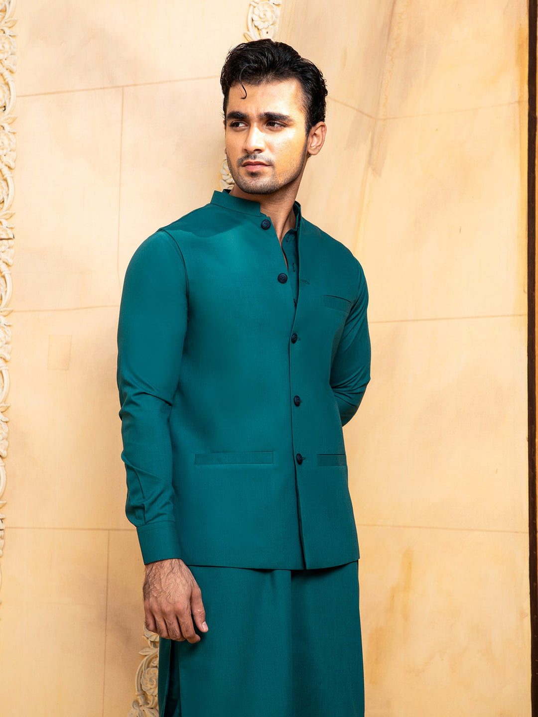 Shahjahan - Teal Kurta Trouser With Waistcoat - 3 Piece