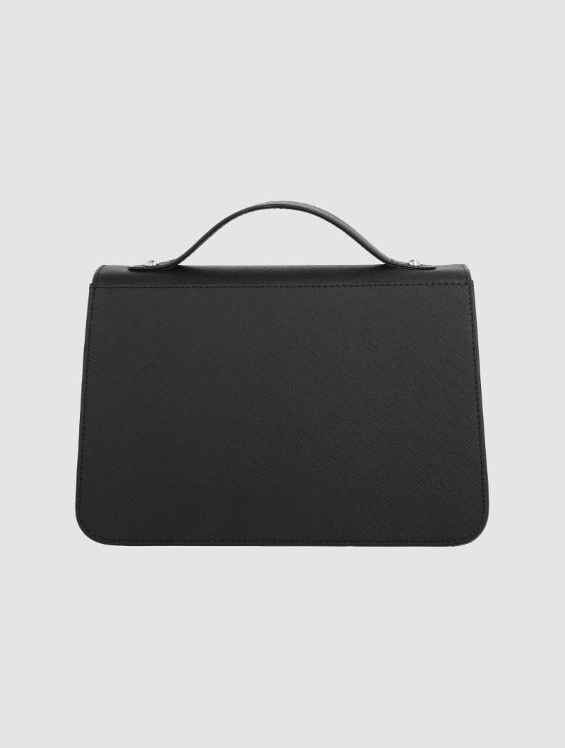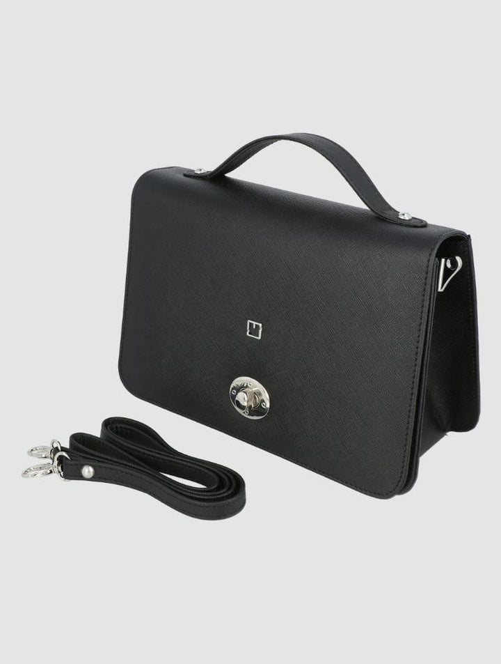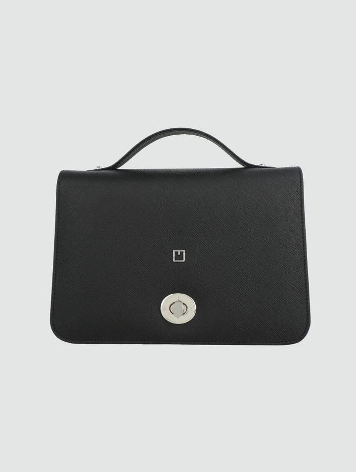 Flap with turn lock closure, top handle, detachable shoulder strap, central zip compartment, one interior slip pocket. 248mm x 95mm x 175mm.