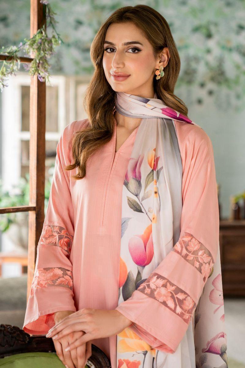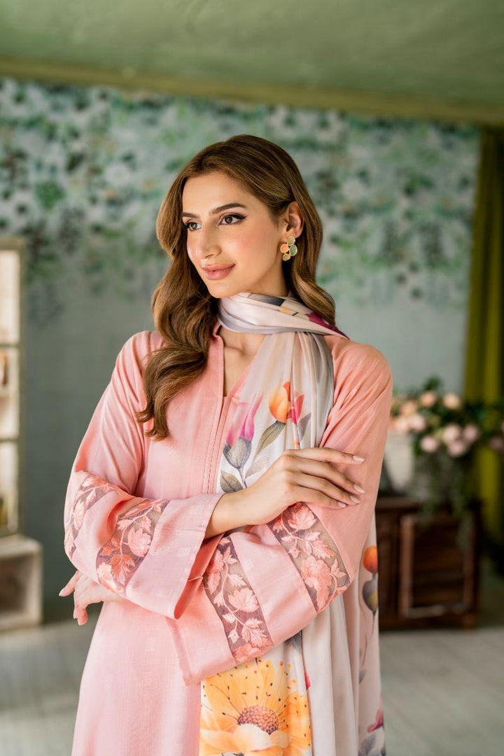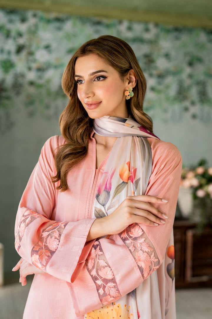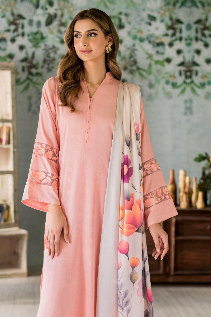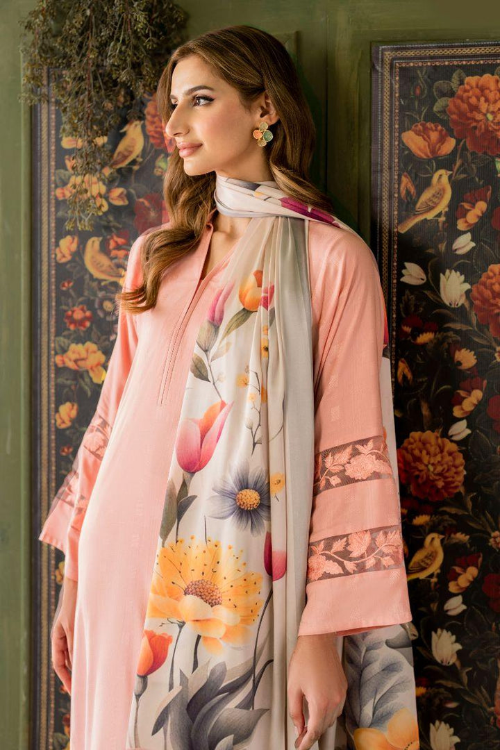 Composition Tunic: Textured Self Dobby Cotton silk blend Pants: Textured Self Dobby Cotton silk blend Dupatta : Printed Silk Dry Clean Only peach self embossed with embroidered sleeves (three piece set) Set against a self embosed peach canvas adorned with embroidery along the sleeves- this ensemble is the embodiment of feminine glamour. Complete your look with narrow eg trousers and a romantic printed duppatta for a polished edit.