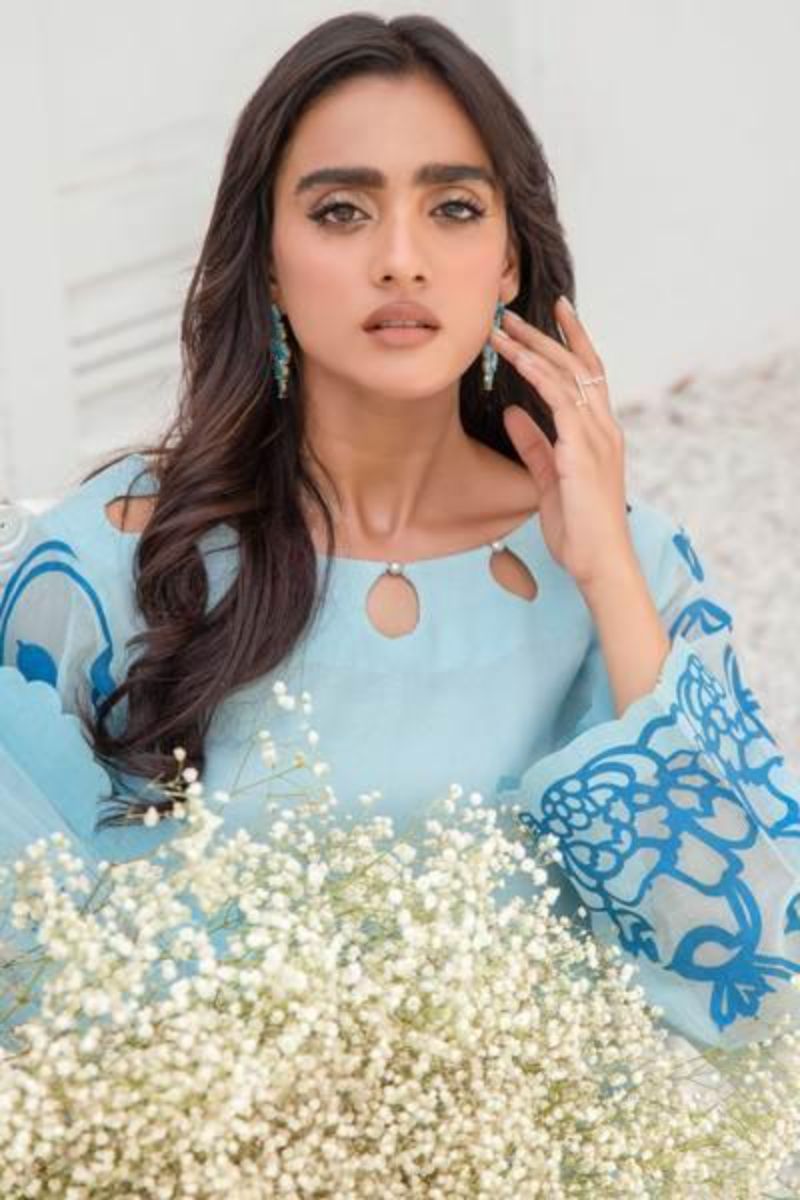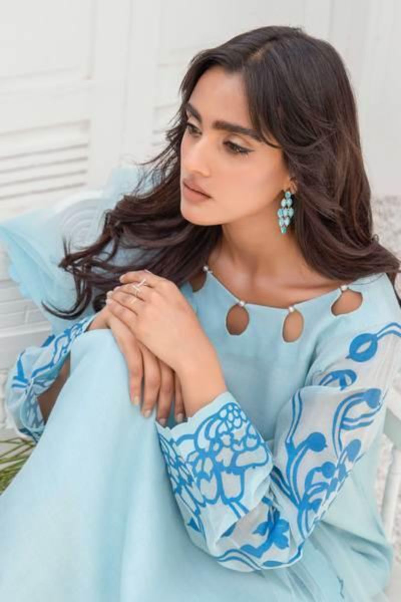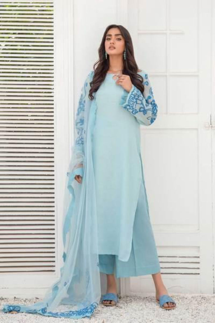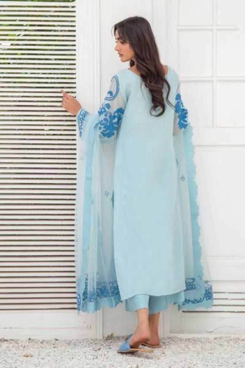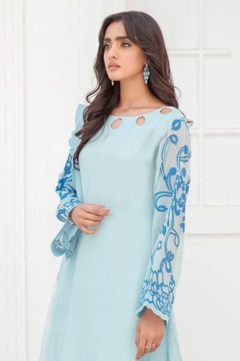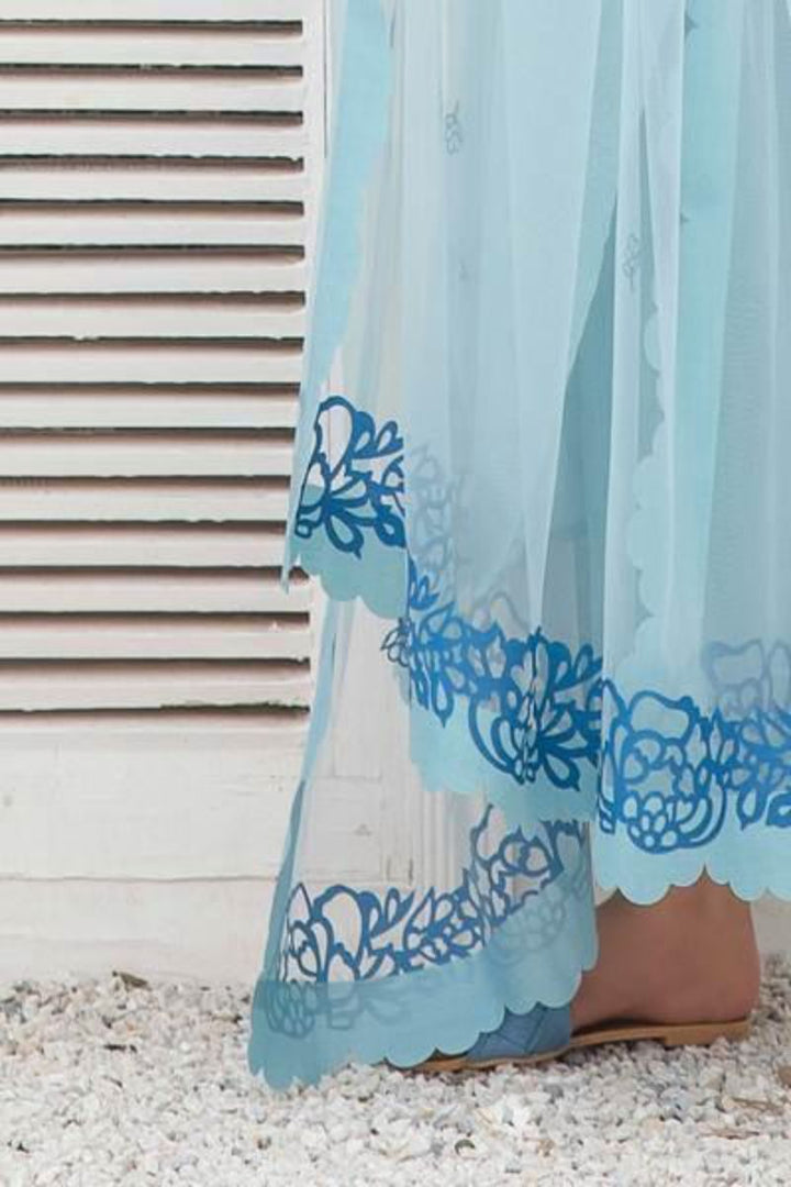 Blue tunic with cutout neckline and applique (three piece set) A striking choice for summer, the 'Delilah' tunic in welkin blue is decorated with elegant pearls at the neckline. The cut-out detailing, intricate applique and calf-sweeping silhouette all ensure this piece offers optimum glamour. The duppatta is adorned with applique and scallop edging along four sides. Style it with flats or barely there heels this summer!