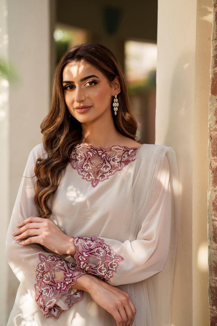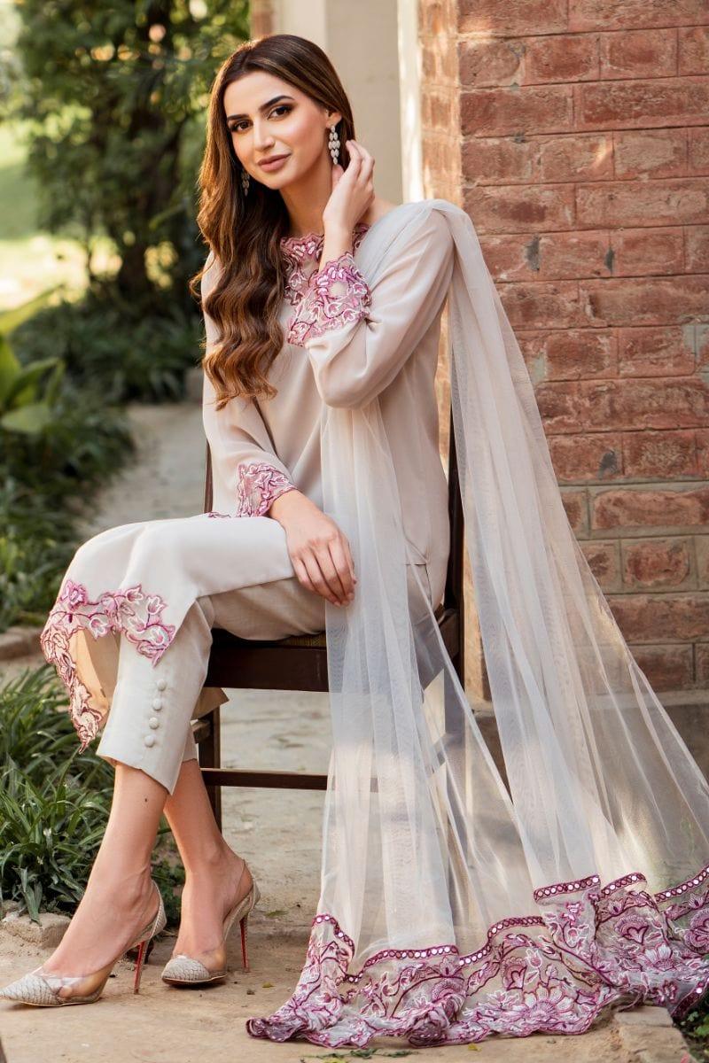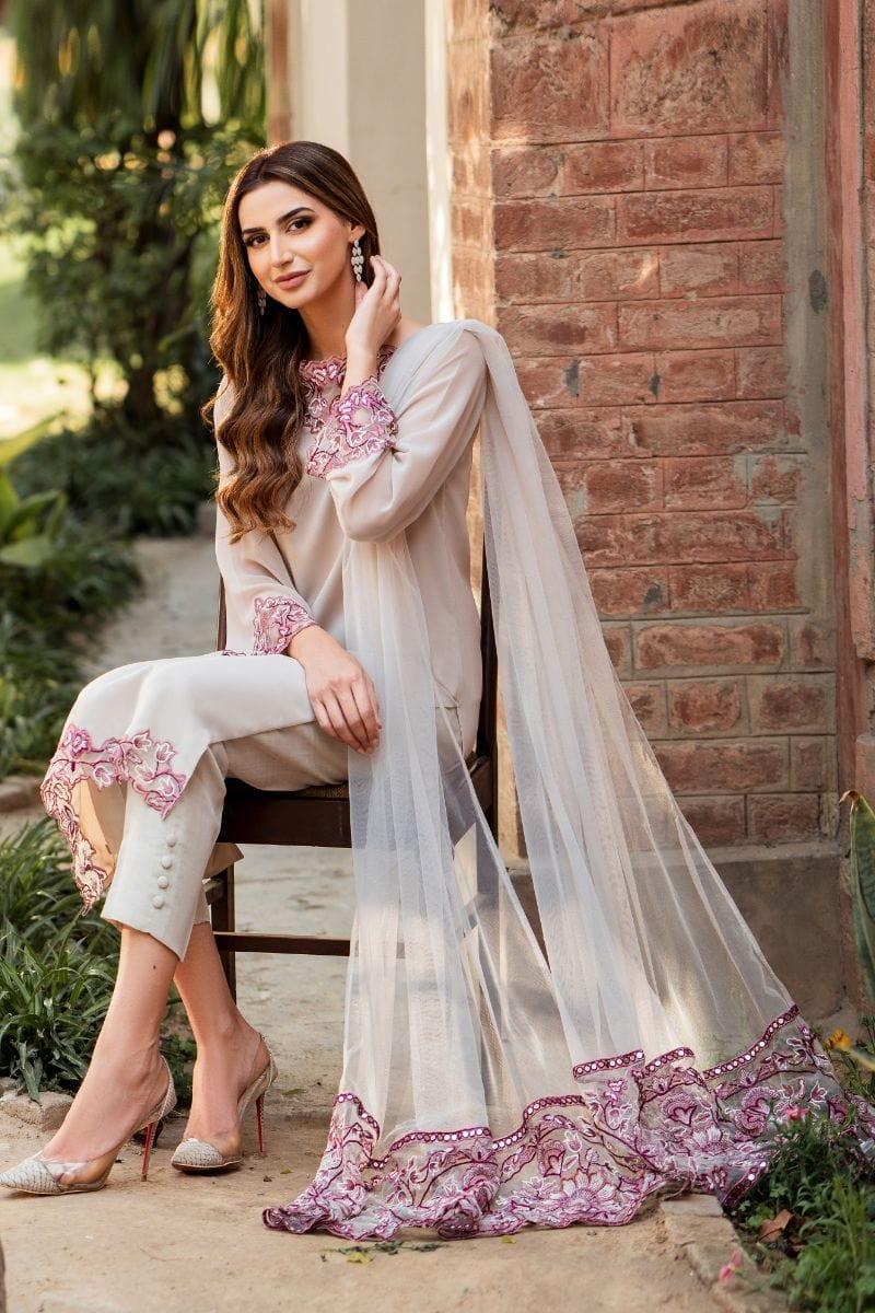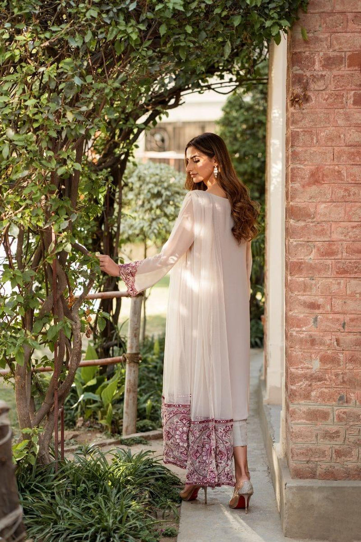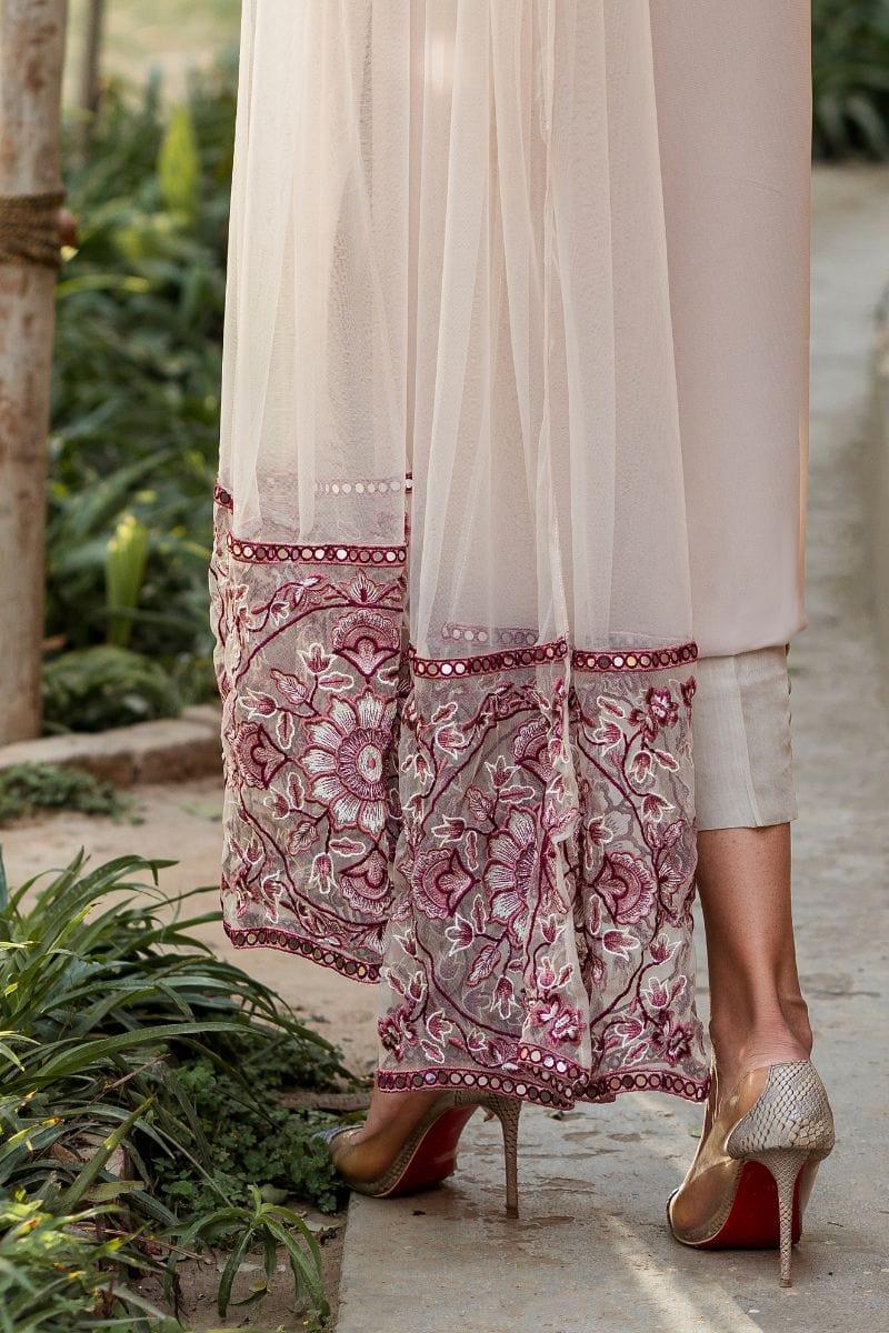 As divisive as it is delightful, this parfait nude attire is the epitome of romanticism. A soft beige offset by embroidery in hues of pink and deep magenta. The long hem shirt is accentuated with a sheer neckline and daman, paired with a striking net duppatta adorned with a heavily embroidered border and straight leg trousers.
