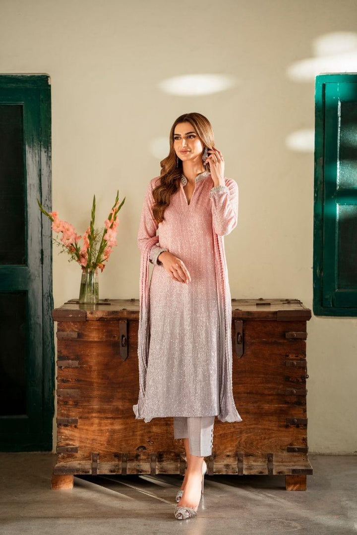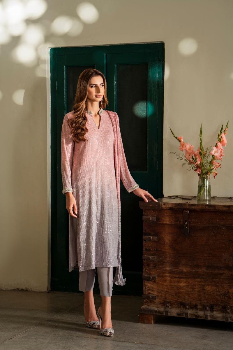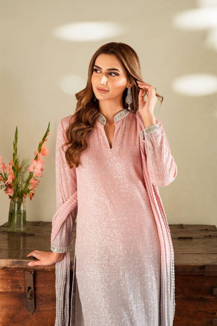 Set against a glittering ombre canvas from pink to lilac and adorned with a crystalised neckline and sleeves- this ensemble is the embodiment of feminine glamour. Complete your look with narrow-leg trousers and a crushed silk dupatta.