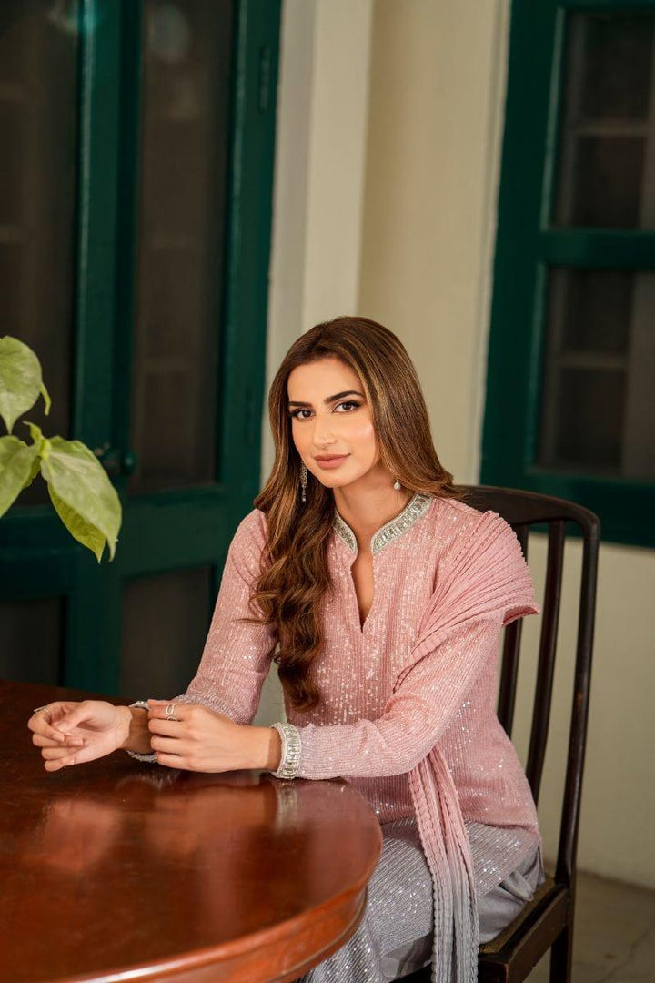 Ushna Shah in Natasha Kamal - Pink Embroidered Net Shirt and Raw Silk Pants with Ombre Crushed Silk Dupatta - 3 Pieces