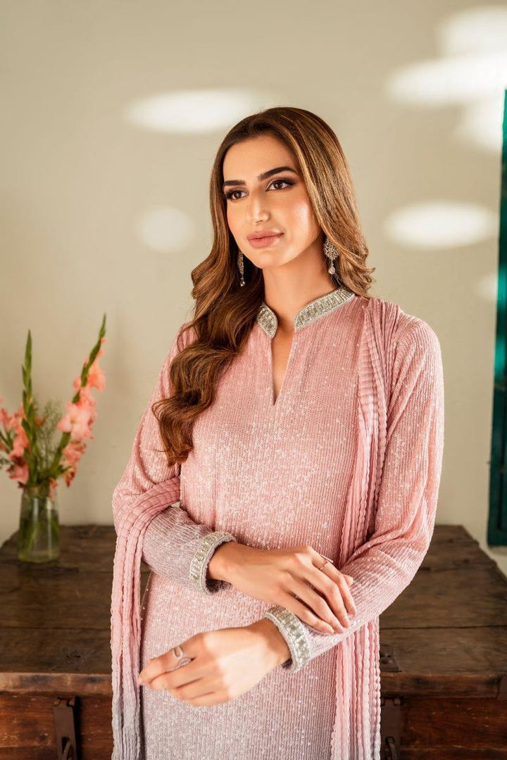 Ushna Shah in Natasha Kamal - Pink Embroidered Net Shirt and Raw Silk Pants with Ombre Crushed Silk Dupatta - 3 Pieces - Studio by TCS