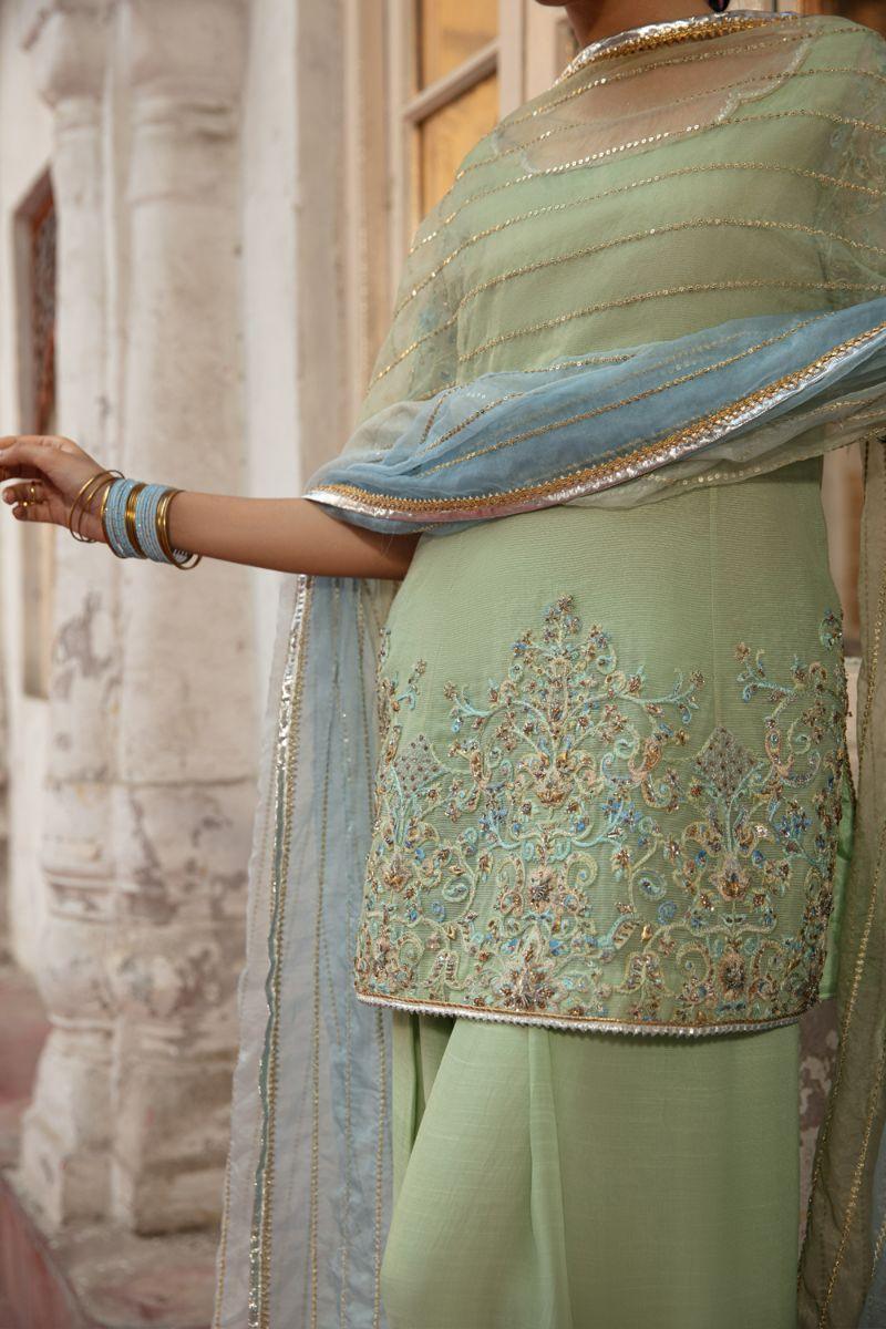 Introducing "Adeena," a shalwar kameez set crafted from luxurious Khadi net fabric. The mint green base is embellished with captivating silk and tilla embroidery. The shirt features a stunning neckline adorned with metallic gota lace, perfectly complementing the intricate embroidery and delicate bead and gota kinari accents. Embroidered borders on the sleeves and accented trims further enhance the ensemble's elegance. The matching raw silk pants are detailed with embroidered borders along the hem, while the dupatta, featuring rich stripes and gota kinari on all four sides, echoes the mint green and blue hues. This set is ideal for women celebrating festive seasons with grace and sophistication.