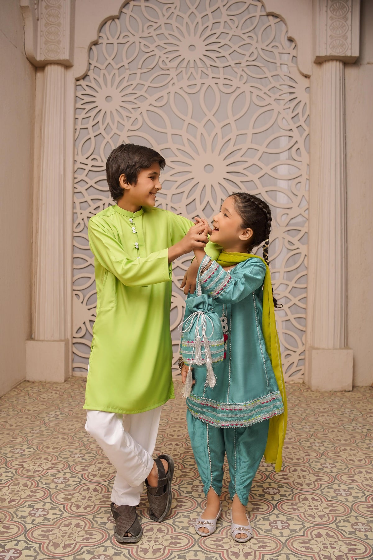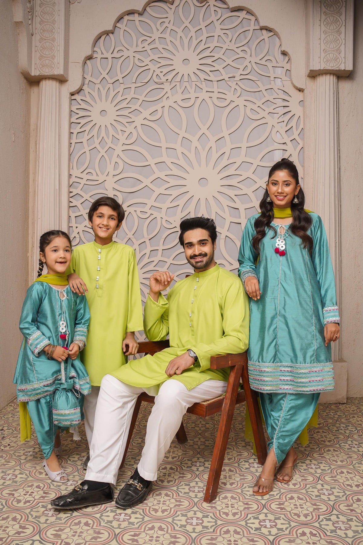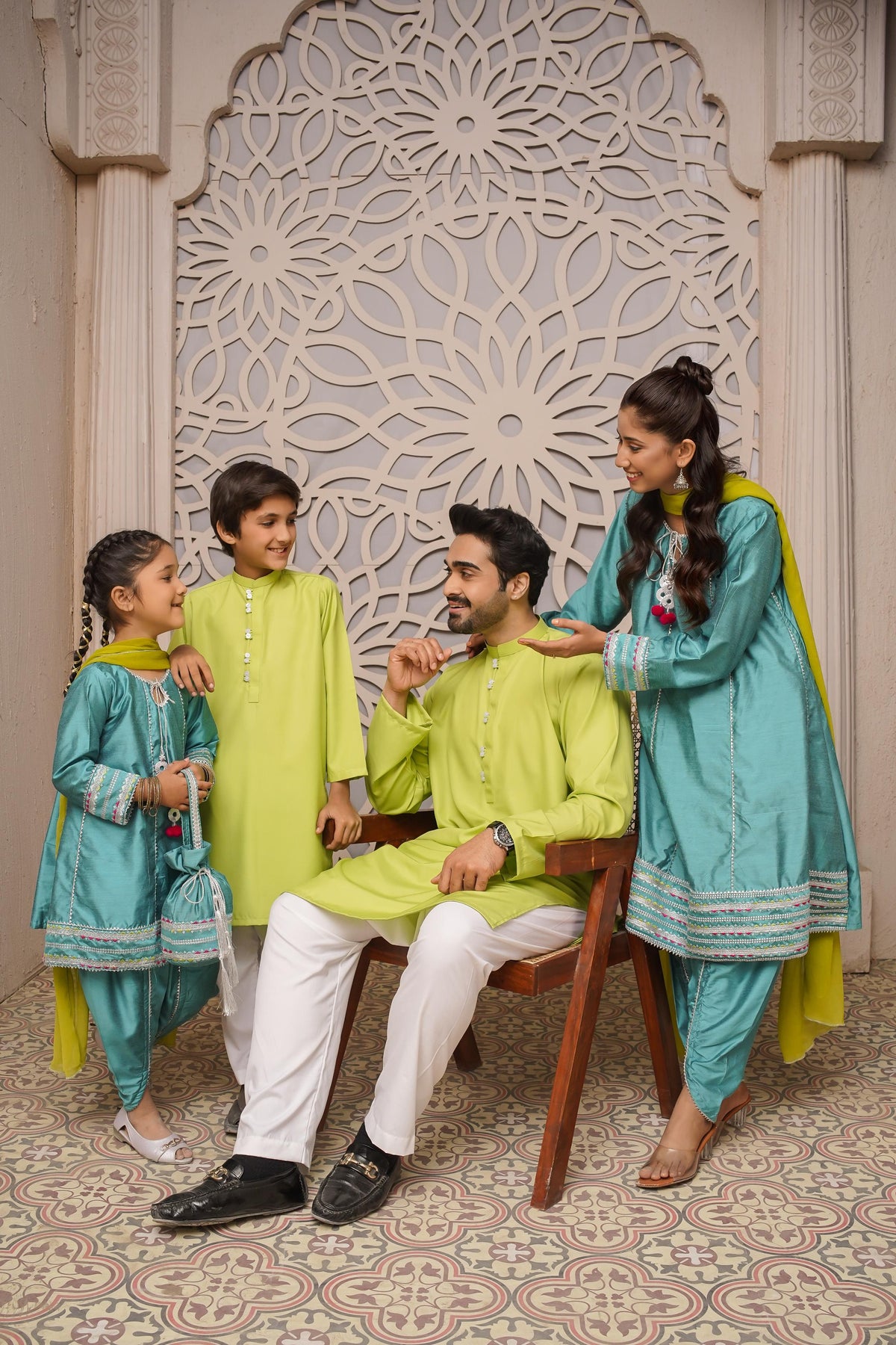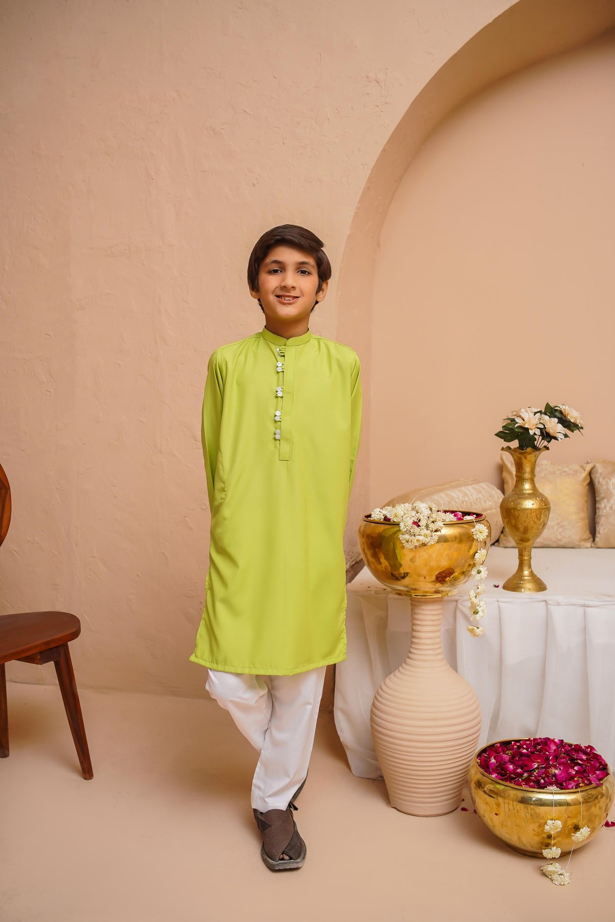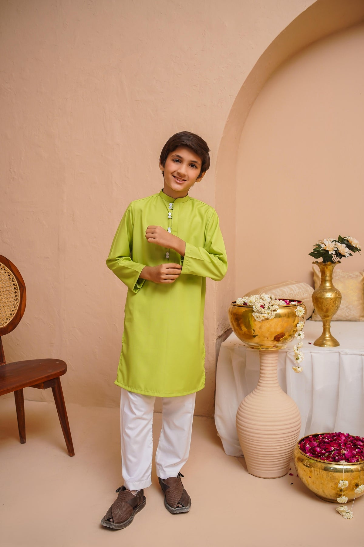 Make dressing up effortless with this apple green kurta pajama set. Crafted from soft, wash-and-wear fabric, the kurta boasts button detailing for a polished look, while the matching pajama keeps it classic.