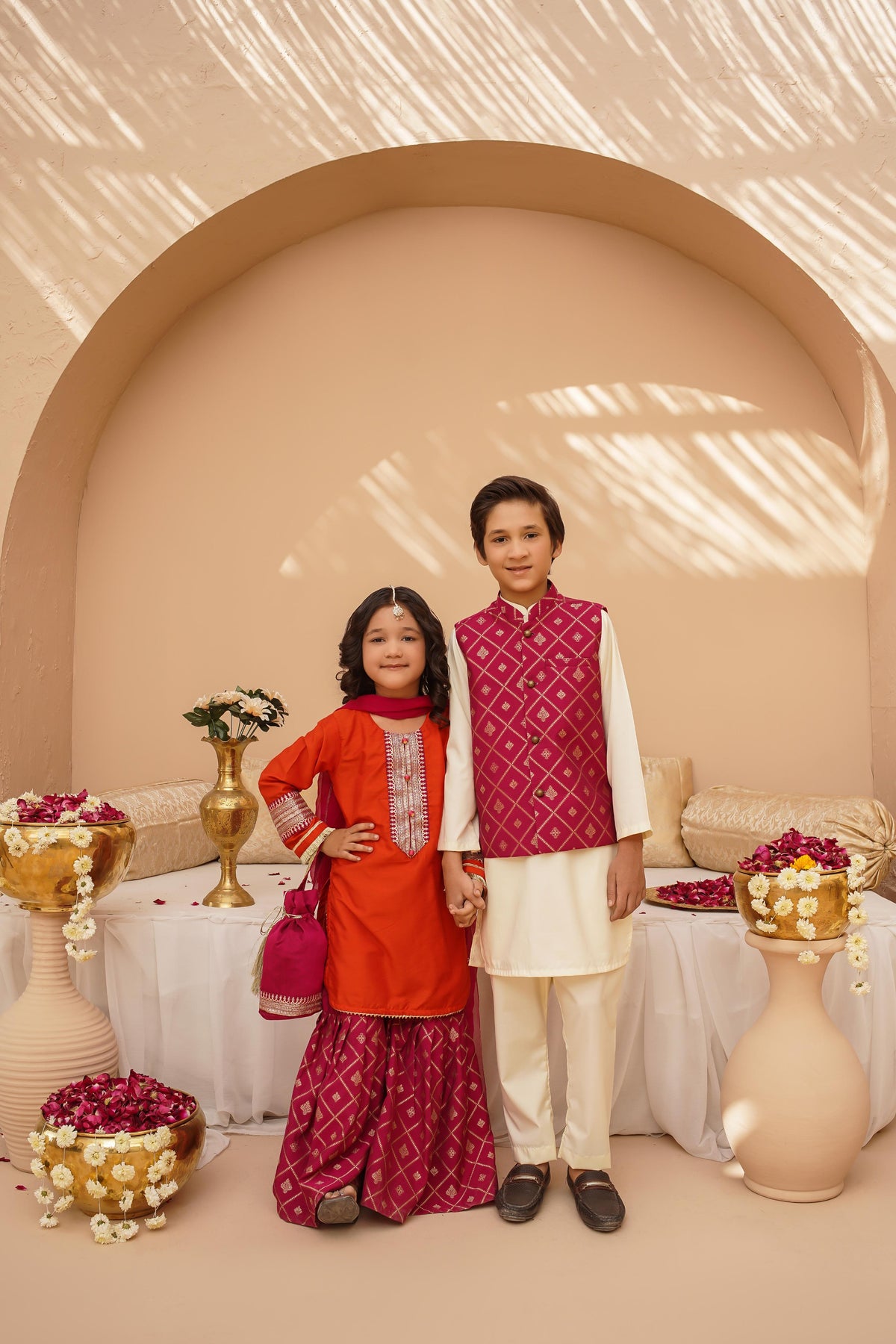 Dress your little gentleman in this sophisticated three-piece ensemble featuring a printed jacquard pink waistcoat, paired with a cream wash-and-wear kurta and pajama. Designed for comfort and style.