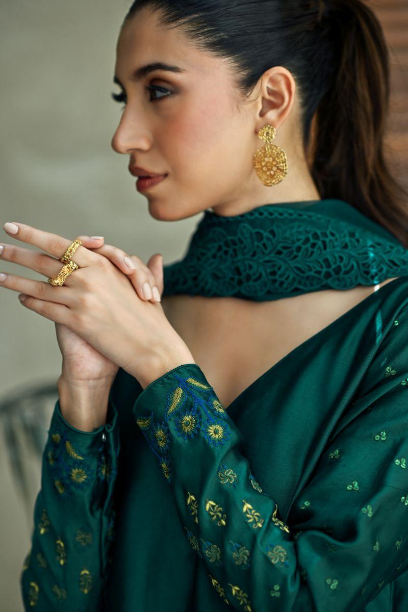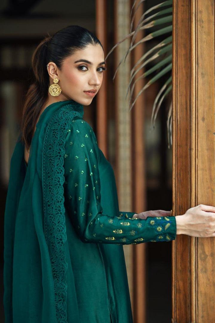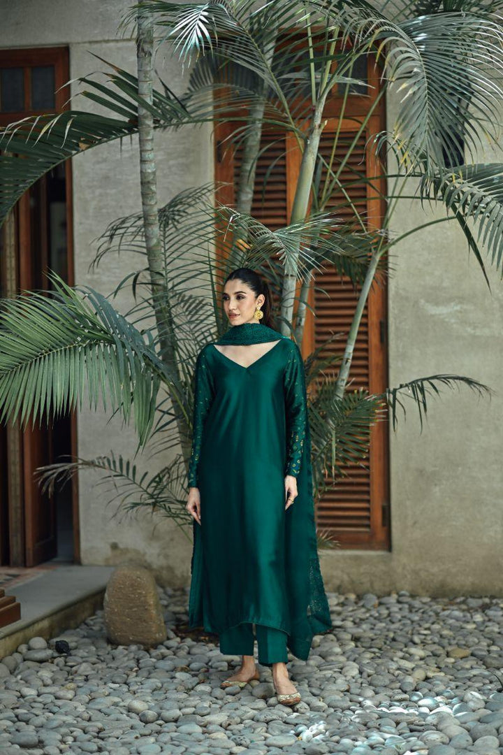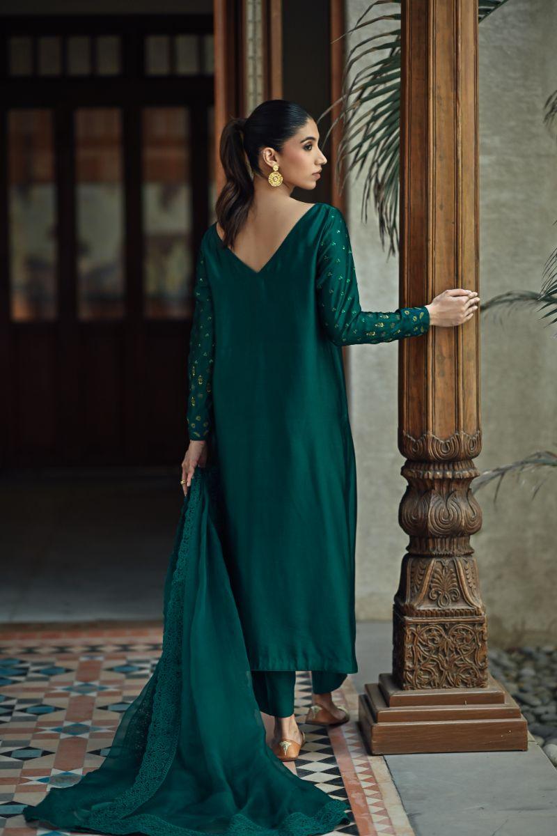 Indulge in regal elegance with this emerald green silk outfit. Adorned with intricate resham embroidery on the sleeves, it exudes timeless charm. Complete with a delicate organza dupatta and sleek straight silk pants, this ensemble embodies sophistication and grace